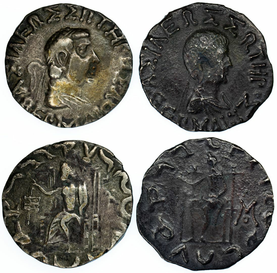 Indo-Greek Kingdom, Hermaios (c. 105-95 BC), AR Tetradrachm, Indo-Skythian Imitations (2): i) c. 90-75 BC, diademed and draped head right, rev. Zeus Mithra seated to left holding sceptre, making a benediction gesture with his right hand, monogram in left field, 8.79g (Mitchener 418), slight brass tone, good fine to very fine; ii) another, struck at KAbul, c. 80-75 BC, obverse as before, rev. Zeus enthroned left, raising hand and holding sceptre, monogram to outer right field, 7.42g (Senior, Hermaios 18T.1; Bopearachchi 10A; SNG ANS –; HGC 12, 298), darkly toned, very fine