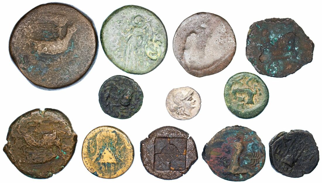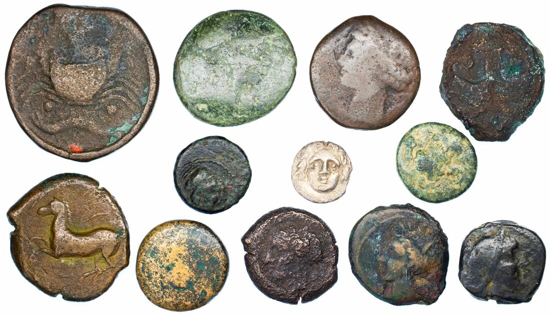 a Selection of Greek Bronze (12): i) Bronze of Akragas 15.55g; ii) Syracuse AE 17 (ex Leeds Museum exhibit 12/2 Autumn 1994) 3.84g; iii) Sicily Aleasa 8.03g 340 BC; iv) 1.17g Sicily(?) Owl in wreath; v) Zeugitania AE Palm/Horse head 5.35g (Weber 8485); vi) another 2.11g full horse; vii) another, 346-146 BC head of Persephone/horse head right letter, 3.35g; viii) Macedonia Interegnum 286-277 BC, 3.96g; ix) Macedonia Pella head of Apollo/Tripod, 3.86g; x) Selge obol, Athena/Gorgon 0.90g; xi) Selge AE, Heracles/Stag, 2.07g; xii) Side AE, 5.70g BMX pl. XXVIII 6 (12)