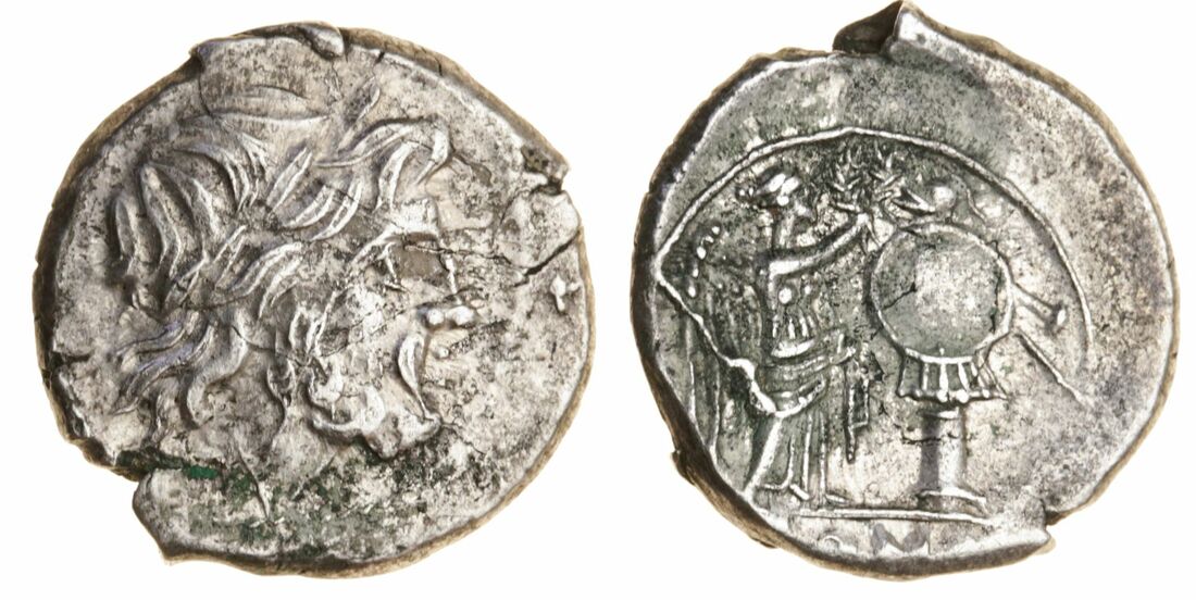 Roman Republic, Anonymous Issues (c. 211-208 BC), AR Victoriatus, 3.67g, 7h, uncertain mint in Sicily (RRC 70/1; Sydenham 83; RSC 9), the reverse off-centre and two mild striking splits, otherwise lustrous almost extremely fine