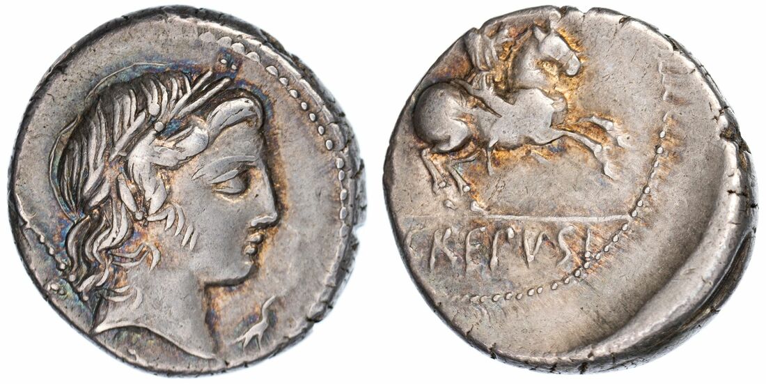 Roman Republic, (82 BC) AR Denarius, issued by P. Crepusius, head of Apollo right, sceptre over shoulderrev. horseman right, brandishing spear, P CREPVSI in exergue. 3.86g (Crawford, 361/1c ; BMCRR Rome, 2683 ; RSC Crepusia, 1), reverse off-centre but otherwise lovely old cabinet tone and clear, sharp details in high relief, good very fine