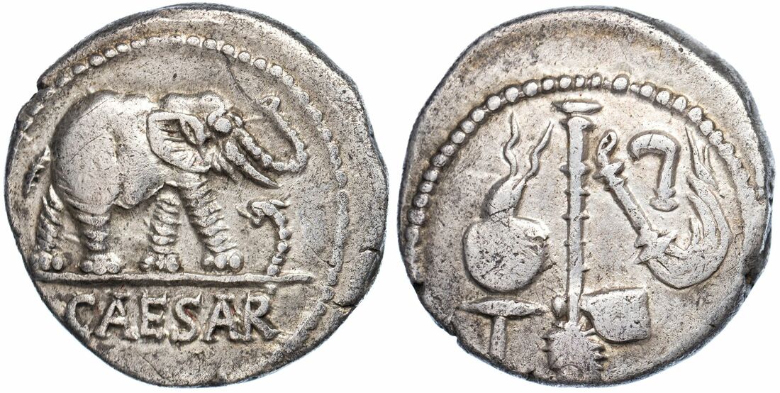 Roman Republic, Julius Caesar, AR Denarius, Military mint traveling with Caesar, April-August 49 BC, elephant advancing right, trampling horned serpent, CAESAR in exergue, rev. emblems of the pontificate: simpulum, aspergillum, securis, and apex, all within dotted border, 10h, 3.68g (Crawford, 443/1; CRI, 9; Sydenham, 1006; RSC, 49; BMCRR, Gaul 27-30), slightly off-centre, with some contact-marking, otherwise well-struck and quite detailed, very fine