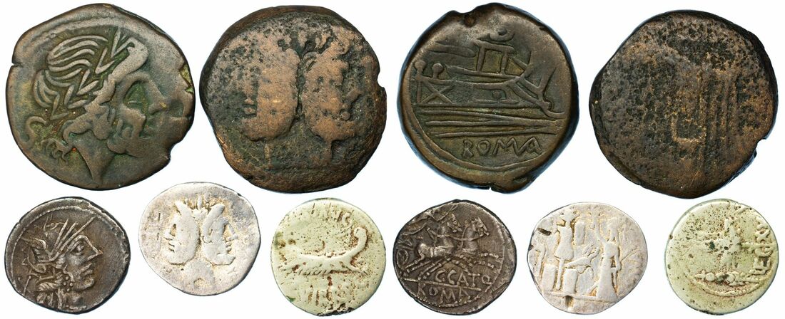 a Selection of Coins of the Roman Republic, i) Prow of Boat AE 17.70g (Leeds Museum Exhibit 5/8 Autumn 1994); ii) Janus Heads As, 17.28g; iii) Philus denarius Janus head 3.22g; iv) C. Portius Cato Denarius, 3.77g; v) Mark Antony 'Galley' denarius, 2.70g (5)