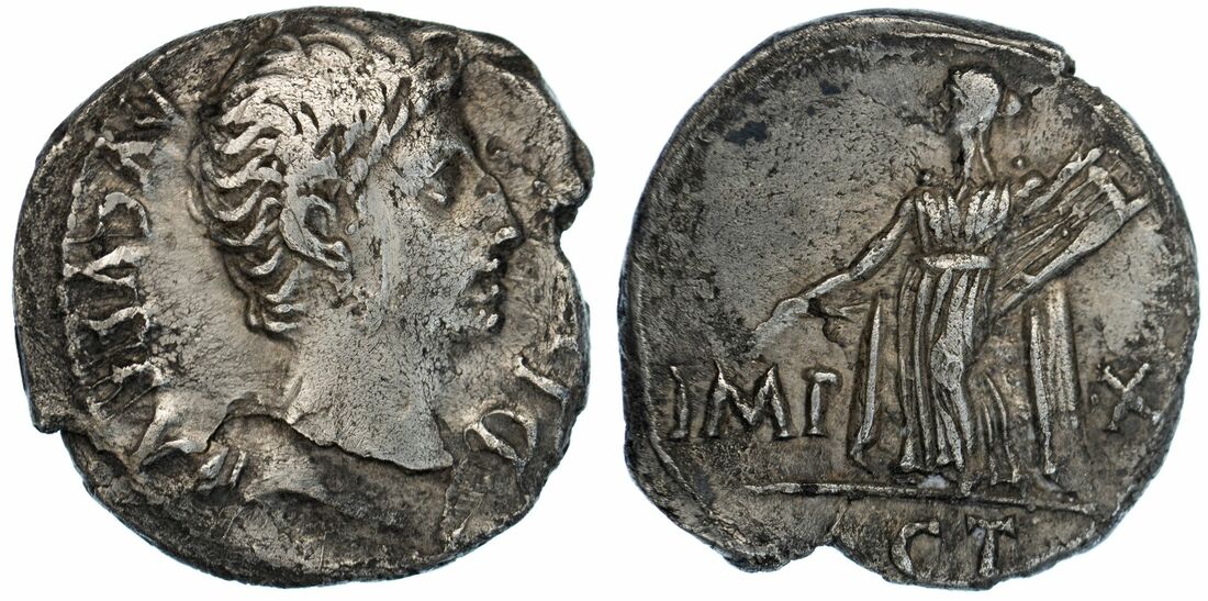 Roman Empire, Augustus (27 BC-AD 14), AVGVST DIVI F, bare head right, rev. IMP X, Apollo Citharoedus of Actium standing facing, head left, holding plectrum in his right hand and lyre in his left,