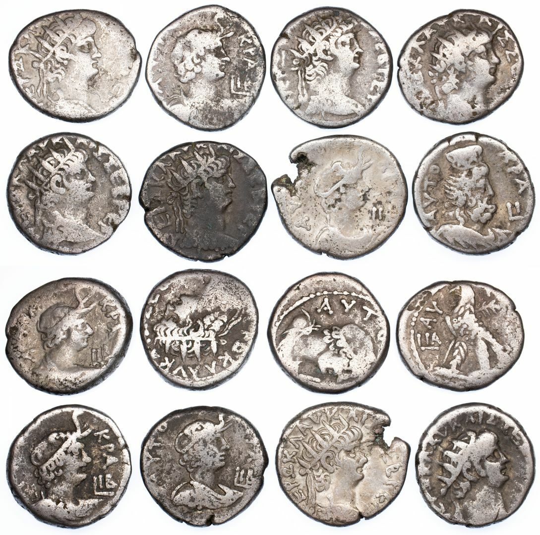 Roman Empire, a Selection of Neronian Provincial Tetradrachmae (8): i) Alexandria, dated RY 12=AD 65-66, NERO KLAI KAIS SEV GER, radiate bust of Nero right, wearing aegis, rev. AUTO KRA, draped bust of Alexandria, right, wearing headress of elephant skin, date mark to right field, 13.07g, (Milne, 238/245; RPC, 5289; Dattari, 204); ii) another, as before, 13.59g; iii) another, as before, 13.03g; iv) another, as before, 13.33g; v) another, as before, 12.18g; vi) another, as before, 13.78g; vii) another, dated RY 10=AD 63/5-64/5, obverse as before, rev. bust of Sarapis right, date to right field, 12.28g (Dattari 251; RPC 5274); viii) another, dated RY 11=AD 64/5, obverse as before, rev. eagle standing left, palm frond behind, date to left field, 12.03g (Dattari 270; RPC 5283), ranging from fine to very fine; (8).