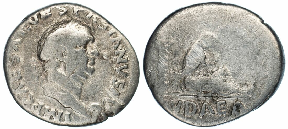 Roman Empire, Vespasian (AD 69-79), AR Denarius, 'Judaea Capta' type, IMP CAESAR VESPASIANVS AVG, laureate head right, rev. IVDAEA in exergue, trophy; to right, Judaea seated right in attitude of mourning, head resting in hand, 3.00g (RIC 2; Hendin 6509; RSC 226), flattened, fine
