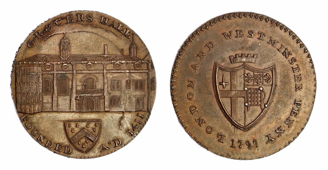 MIDDLESEX, Skidmore's London and Westminster Series, Grocer's Hall, Penny, 1797, view of hall, rev. LONDON AND WESTMINSTER PENNY, shield of arms, I PROMISE TO PAY ON DEMAND THE BEARER ONE PENNY on edge, 12h, 23.48g (D&H 101), usual die flaw to the obverse, with chocolate-red surfaces, extremely fine and scarcely encountered