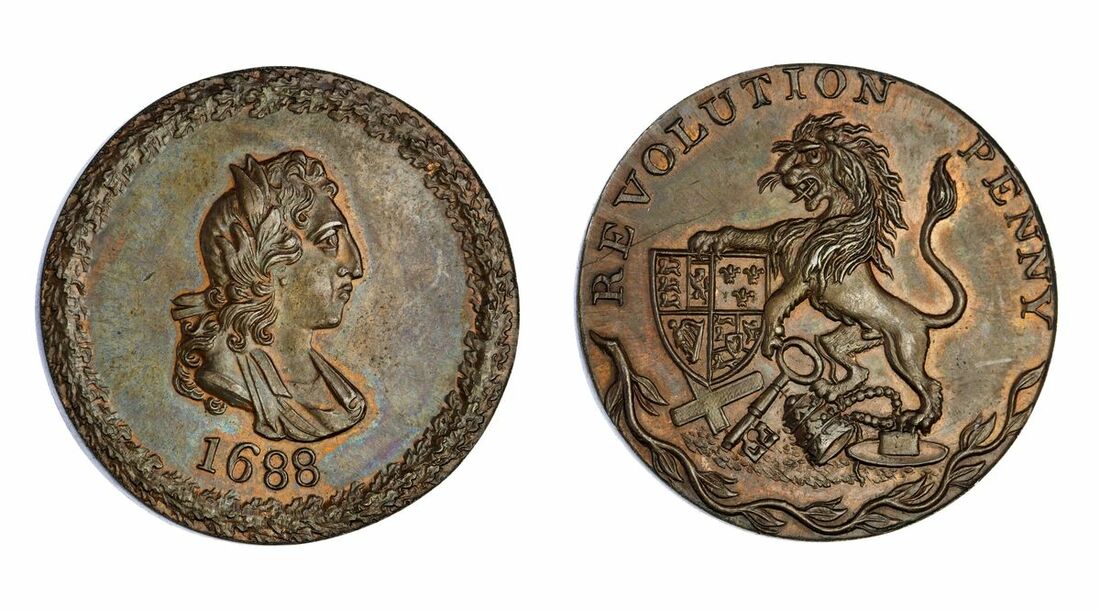 MIDDLESEX, National Series, Centenary of the Revolution Copper Penny, undated, laureate and draped bust right of William III, in wreath, 1688 below, rev. REVOLUTION PENNY, rampant lion supporting English shield, plain edge, 7h, 22.58g (D&H 199), small bruise to the obverse field, otherwise with a flashy brilliance and rich cabinet tone over mint red surfaces, much as struck