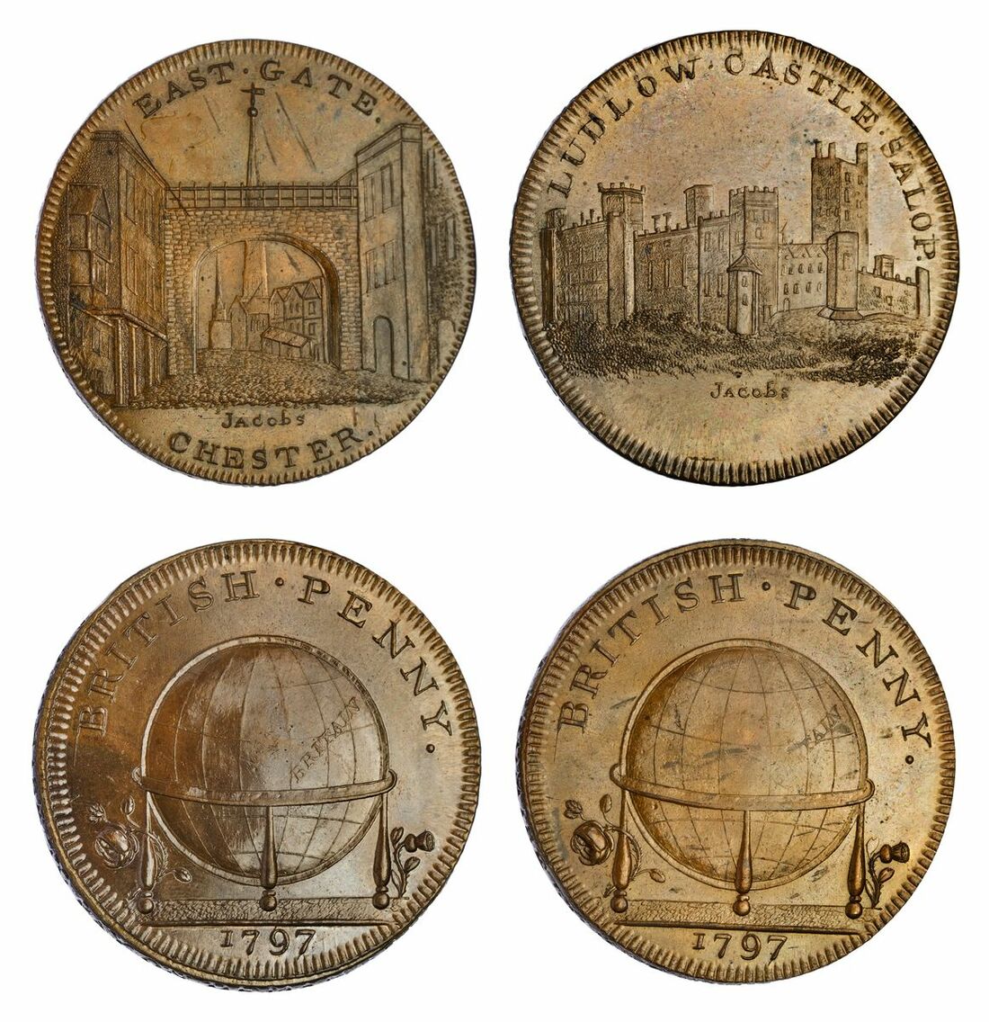 Skidmore's Globe Series, CHESHIRE, Chester, Penny, 1797, EAST . GATE, view of the gateway, CHESTER below, rev. BRITISH . PENNY, globe, I PROMISE TO PAY ON DEMAND THE BEARER ONE PENNY on edge, 12h, 24.56g (D&H 122), lacquered to brown surface, otherwise good extremely fine; SHROPSHIRE, Ludlow, Skidmore's Globe Series, Penny, 1797, LUDLOW . CASTLE . SALOR, view of the castle, rev. BRITISH . PENNY, globe, I PROMISE TO PAY ON DEMAND THE BEARER ONE PENNY on edge, 12h, 23.98g (D&H 134), lacquered appearance to brown surface, otherwise good extremely fine (2)