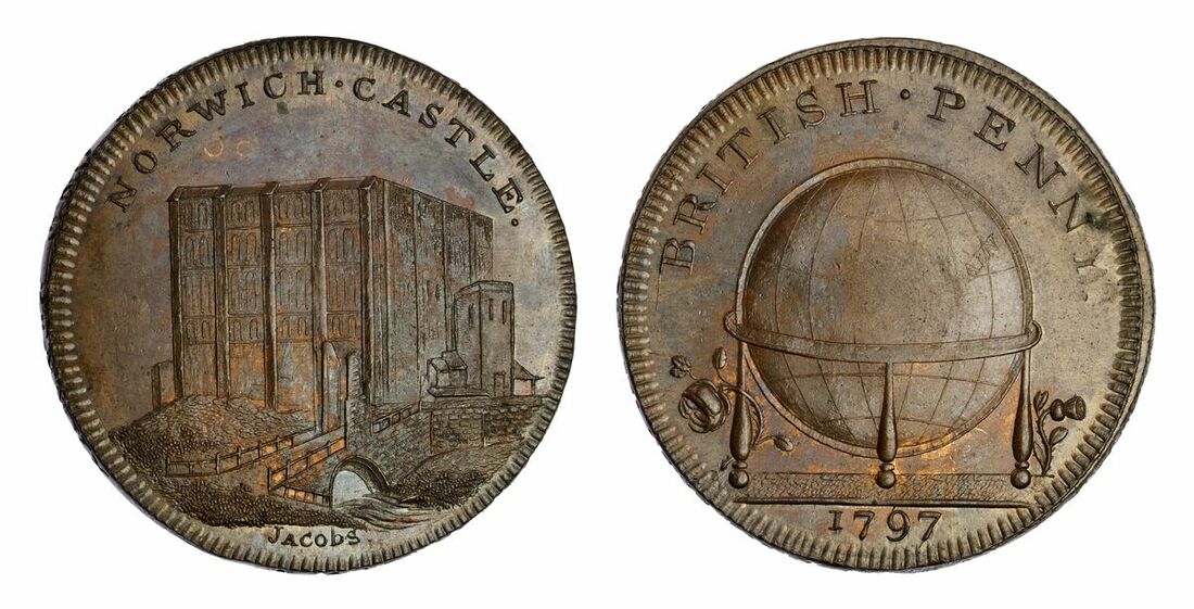Skidmore's Globe Series, NORFOLK, Norwich, Penny, 1797, NORWICH . CASTLE, view of castle, rev. BRITISH . PENNY, globe, I PROMISE TO PAY ON DEMAND THE BEARER ONE PENNY on edge, 12h, 23.80g (D&H 130), toned and lustrous and with hints of mint red beneath, good extremely fine