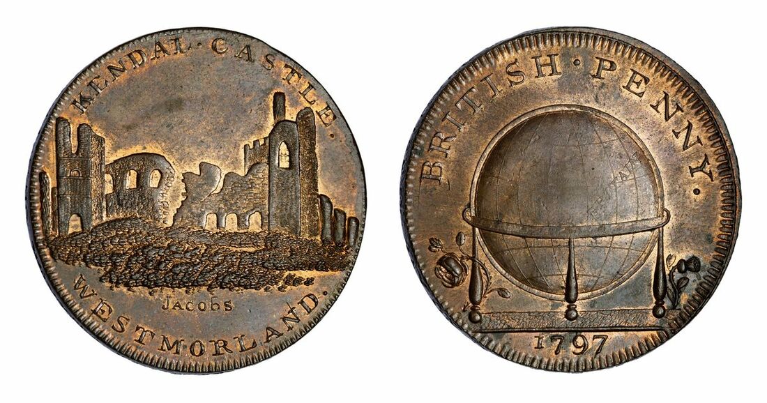 Skidmore's Globe Series, WESTMORELAND, Kendal, Penny, 1797, KENDAL . CASTLE, view of castle ruins, WESTMORELAND below, rev. BRITISH . PENNY, globe, I PROMISE TO PAY ON DEMAND THE BEARER ONE PENNY on edge, 12h, 25.00g (D&H 142), lustrous and mint red around the devices and legends, near as struck