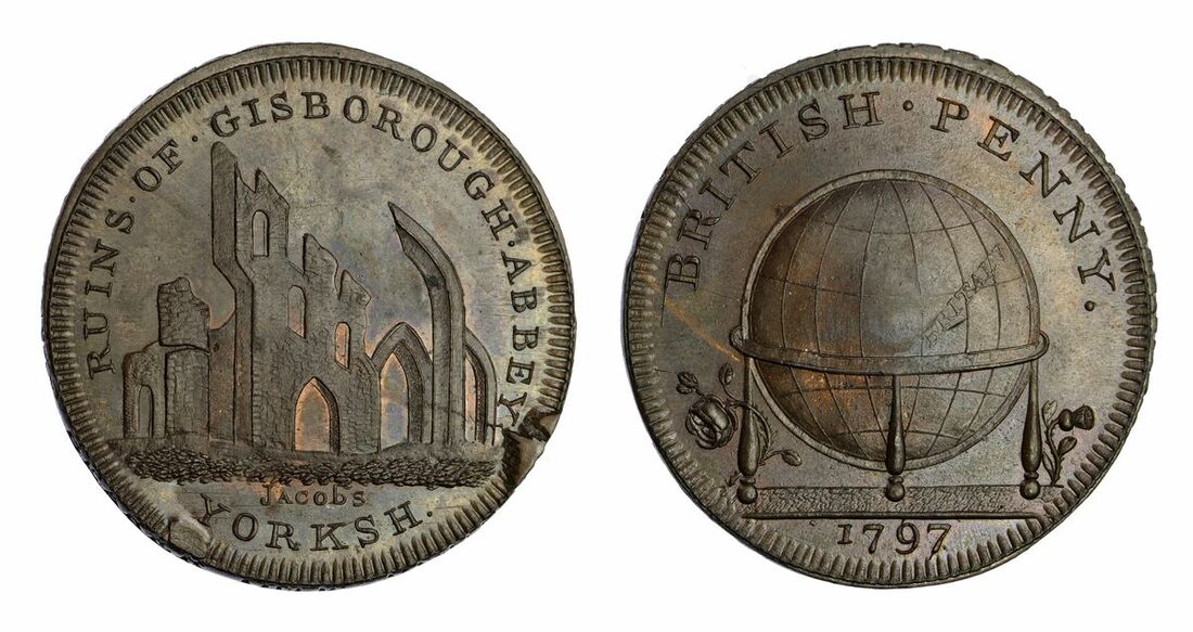 Skidmore's Globe Series, YORKSHIRE, Penny, 1797, RUINS . OF . GISEBOROUGH . ABBEY, view of the castle ruins, YORKSH below, rev. BRITISH . PENNY, globe, I PROMISE TO PAY ON DEMAND THE BEARER ONE PENNY on edge, 12h, 18.34g (D&H 144), metal flaws to the reverse, lustrous and with hints of red within the recesses, good extremely fine
