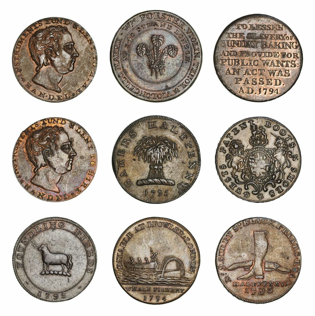 MIDDLESEX, London, Dennis's Halfpenny, 1795, PAYABLE AT I DENNIS LONDON on edge, 6h, 9.22g (D&H 297)< lustrous and red around the devices, good extremely fine; another, as before, obliquely milled edge, 6h, 9.23g (D&H 279d), lightly marked, very fine; Dodd's Halfpenny, undated, plain edge, 5h, 7.67g (D&H 300), previously wiped and with residue in the recesses, yet red to the legends, bolder very fine; another, as before, 6h, 7.77g (D&H 300),some softness to the hair, otherwise residually lustrous and red around the devices, about extremely fine; William Forster, Halfpenny, 1795, plain edge, 6h, 14.89g (D&H 302), toned and with hints of red, extremely fine; Foundling Fields, Halfpenny, 1795, obliquely milled edge, 6h, 8.55g (D&H 305), lightly marked and soft to the obverse, yet hints of red to the reverse, good very fine; John Fowler, Whale Fishery, Halfpenny, 1794, plain edge, 6h, 9.32g (D&H 306), touch of softness, yet some lustre to light brown surfaces, about extremely fine; Barnet Guest, Halfpenny, 1795, PAYABLE AT LONDON on edge, 6h, 8.91g (D&H 308), lightly marked and rubbed in parts, yet flashes of red, very fine; another, as before, 6h, 8.86g (D&H 308), lightly marked and soft in parts, very fine (9)