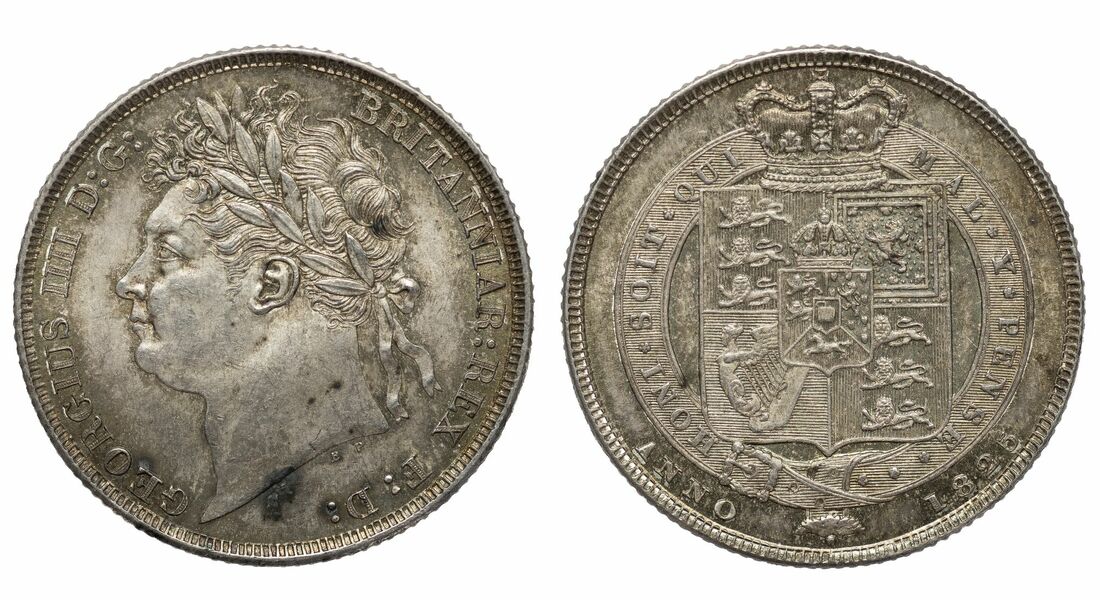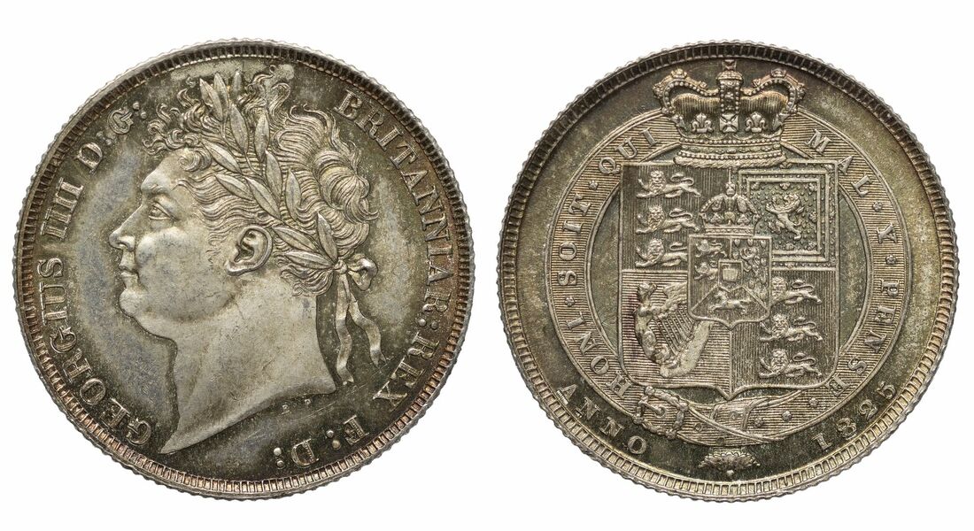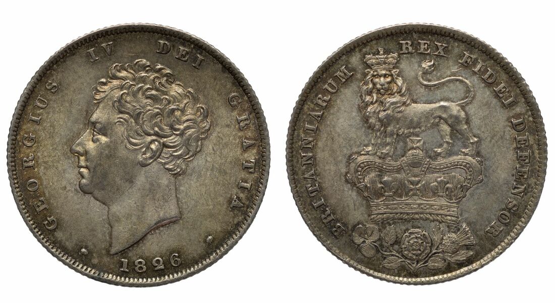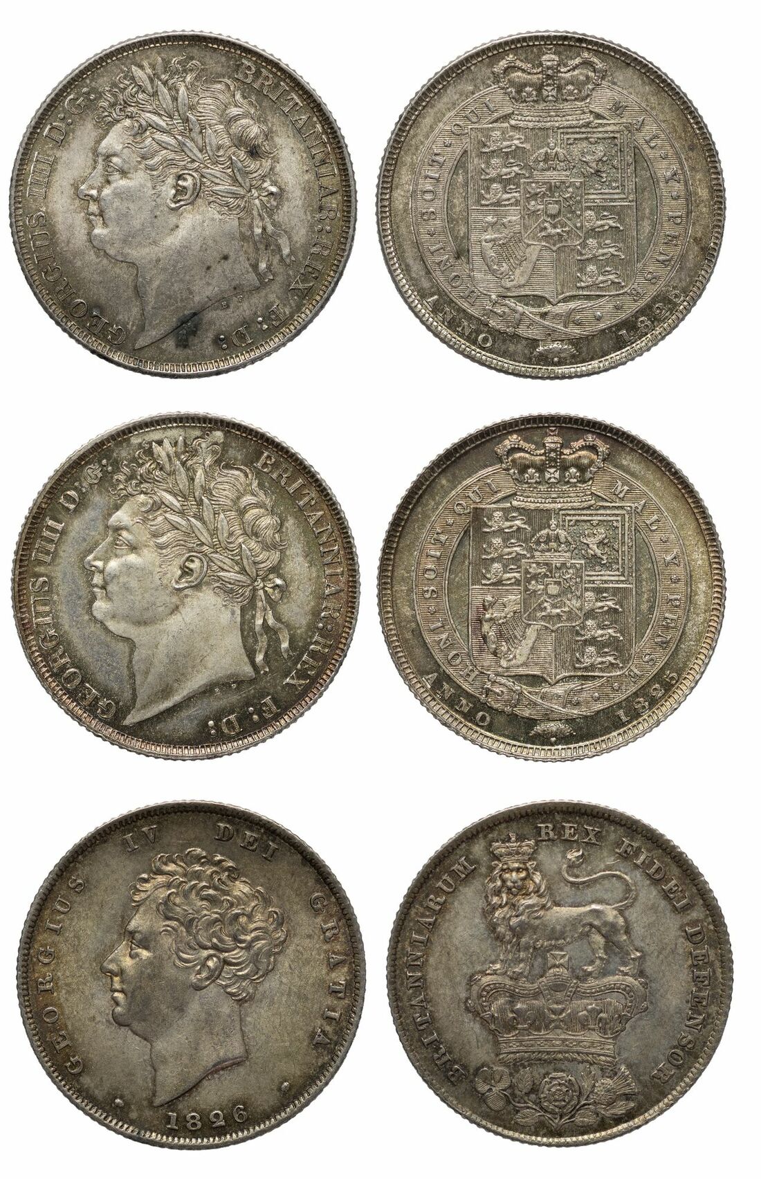 George IV (1820-1830), 'Garter' Shilling, 1825, Type 2, laureate head left, edge milled, 5.64g, 6h (Pywell-Phillips 506; ESC 1253; Bull 2402; S.3811), some dark toning spots on obverse, lustrous with golden toned, extremely fine; another, 1825, Type 2, laureate head left, edge milled, 5.64g, 6h (Pywell-Phillips 506; ESC 1253; Bull 2402; S.3811), minor pinmarking before truncation, lustrous with rich cabinet toning, much as struck; and Shilling, 1826, Type 3, bare head left, rev. lion on crown, milled edge, 5.62g, 6h (Pywell-Phillips 508; ESC 1257; Bull 2409; S.3812), deeply toned, good very fine (3)