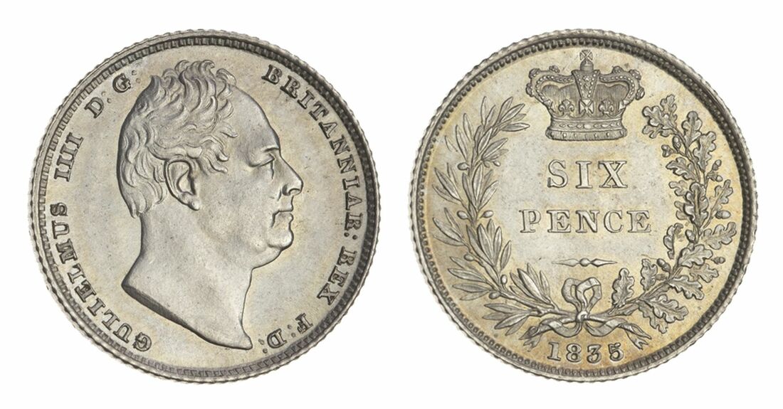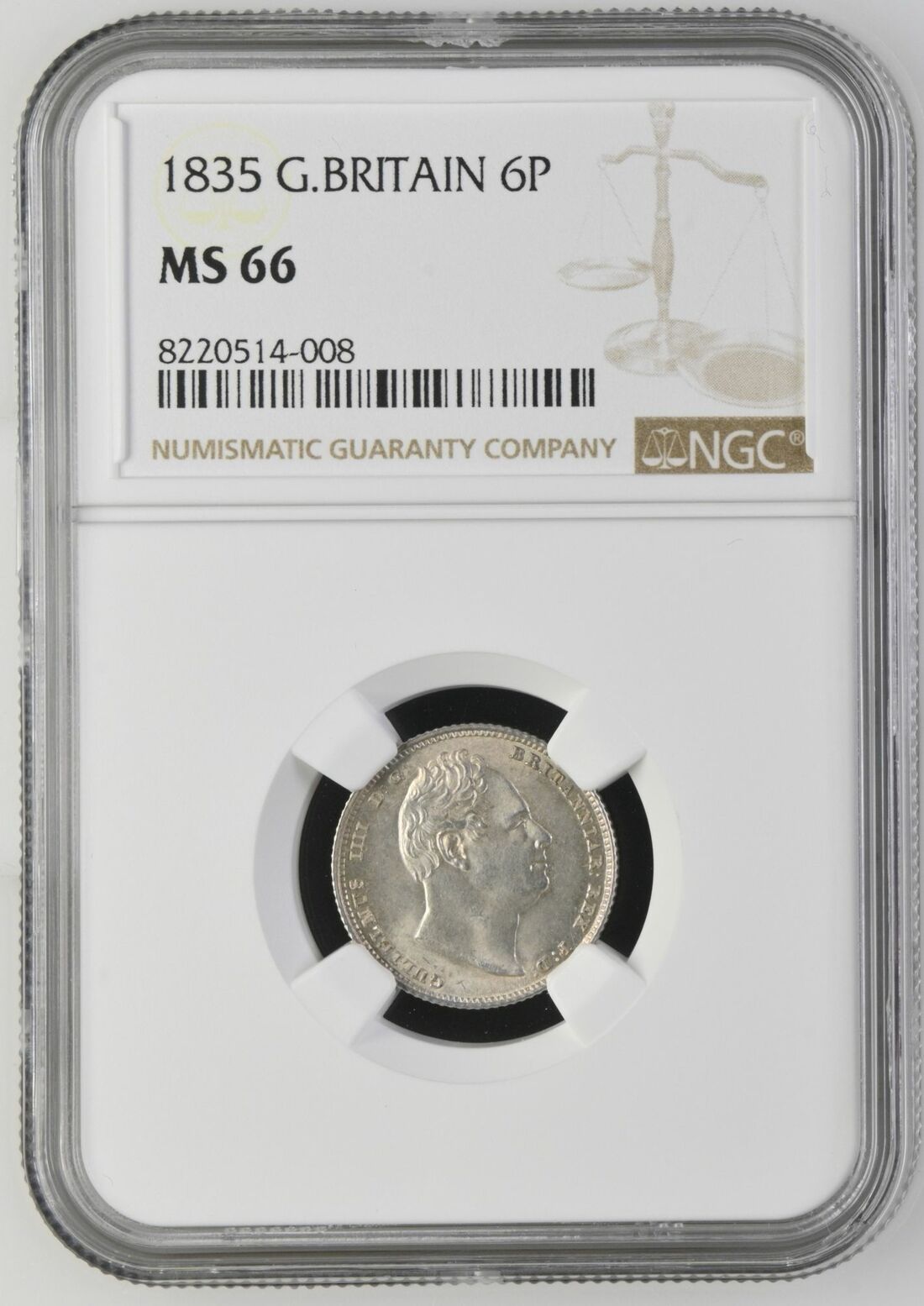 NGC MS66 | *TOP POP* | William IV (1830-1837), Sixpence, 1835, bare head right, rev. crowned denomination within wreath, milled edge, 2.82g, 6h (Pywell-Phillips 542; ESC 1676 [S]; Bull 2508; S.3836), scarce, cartwheel lustre, near uncirculated, graded MS66 *TOP POP* (Cert.#8220514-008)