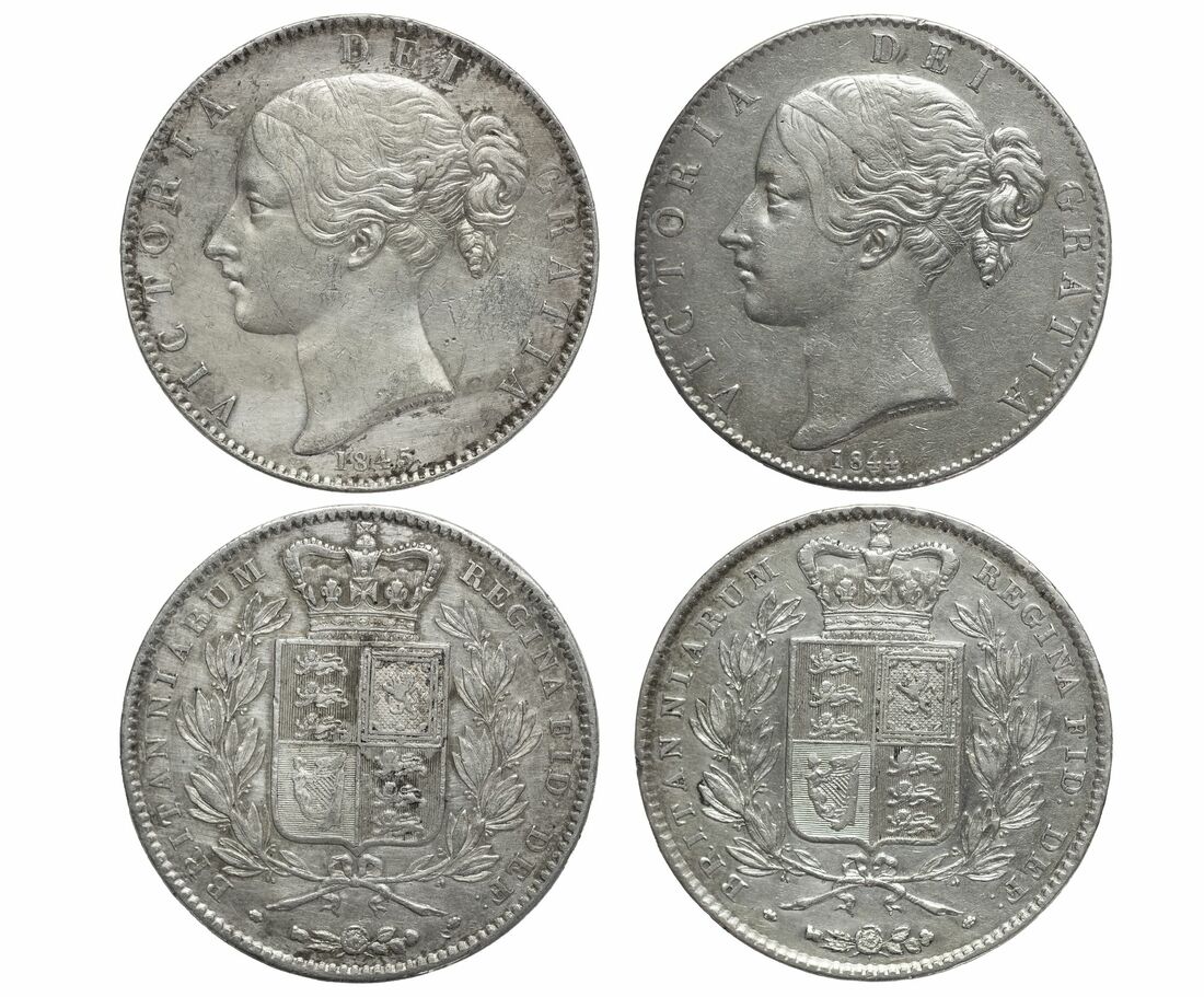 Victoria (1837-1901), 'Young Head' Crowns (2), 1844 VIII, star stops; 1845 VIII, cinquefoil stops, young head left, rev. crowned shield in wreath, incuse downwards lettered edge, 28.16g, 6h; 28.20g, 6h (Pywell-Phillips 562; ESC 280, 282; Bull 2561, 2564; S.3882), the first cleaned, both with a scattering of bagmarks, nonetheless partially toned, the second with a residual lustre, very fine (2)