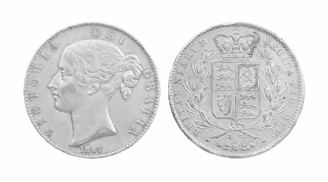 Victoria (1837-1901), 'Young Head' Crown, 1847 XI, cinquefoil stops, young head left, rev. crowned shield within wreath, downwards lettered edge, 6h, 28.21g (ESC 286; Bull 2567; S.3882), edge bruised and lightly bagmarked, with a flash of ochre tone around the devices, very fine