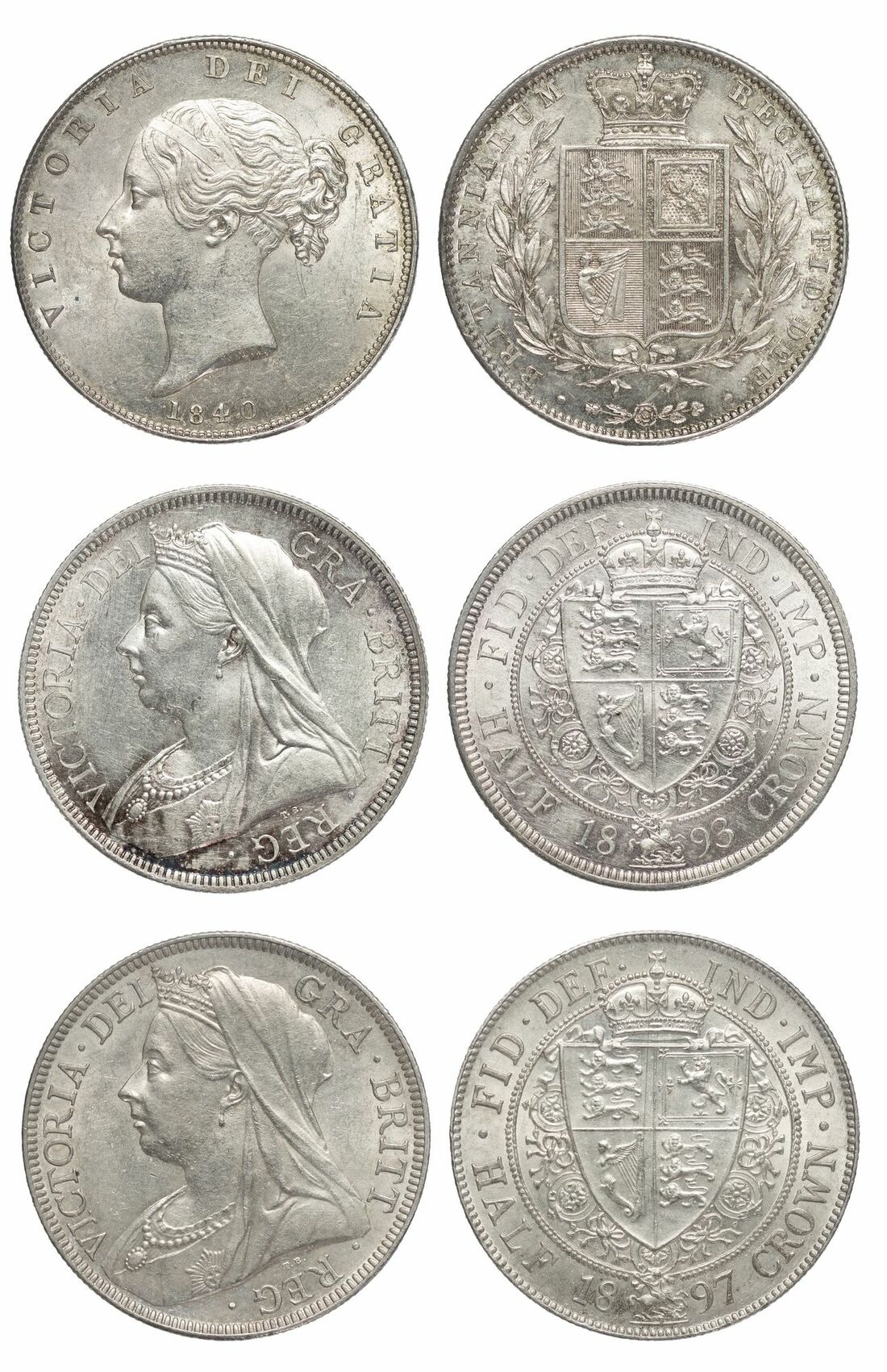 Victoria (1837-1901), 'Young Head', Halfcrown, 1840, type A3, young head left, WW incuse, rev. crowned square-topped shield, milled edge, 14.11g, 6h (Pywell-Phillips 565; ESC 673 [S]; Bull 2715; S.3887), some small green deposits, but lustrous, pleasingly so to the reverse, scarce, very fine / extremely fine; and 'Old Head' Halfcrown, 1893, veiled bust left, rev. crowned shield in Garter, milled edge, 14.17g, 12h (Pywell-Phillips 763; ESC 726; Bull 2778; S.3938), previously wiped but toned subsequently with pink tones, especially below the bust, cartwheel lustre, extremely fine; and 'Old Head' Halfcrown, 1897, veiled bust left, rev. crowned shield in Garter, milled edge, 14.17g, 12h (Pywell-Phillips 767; ESC 731; Bull 2783; S.3938), some pinmarking, lightly toned and lustrous, extremely fine (3)