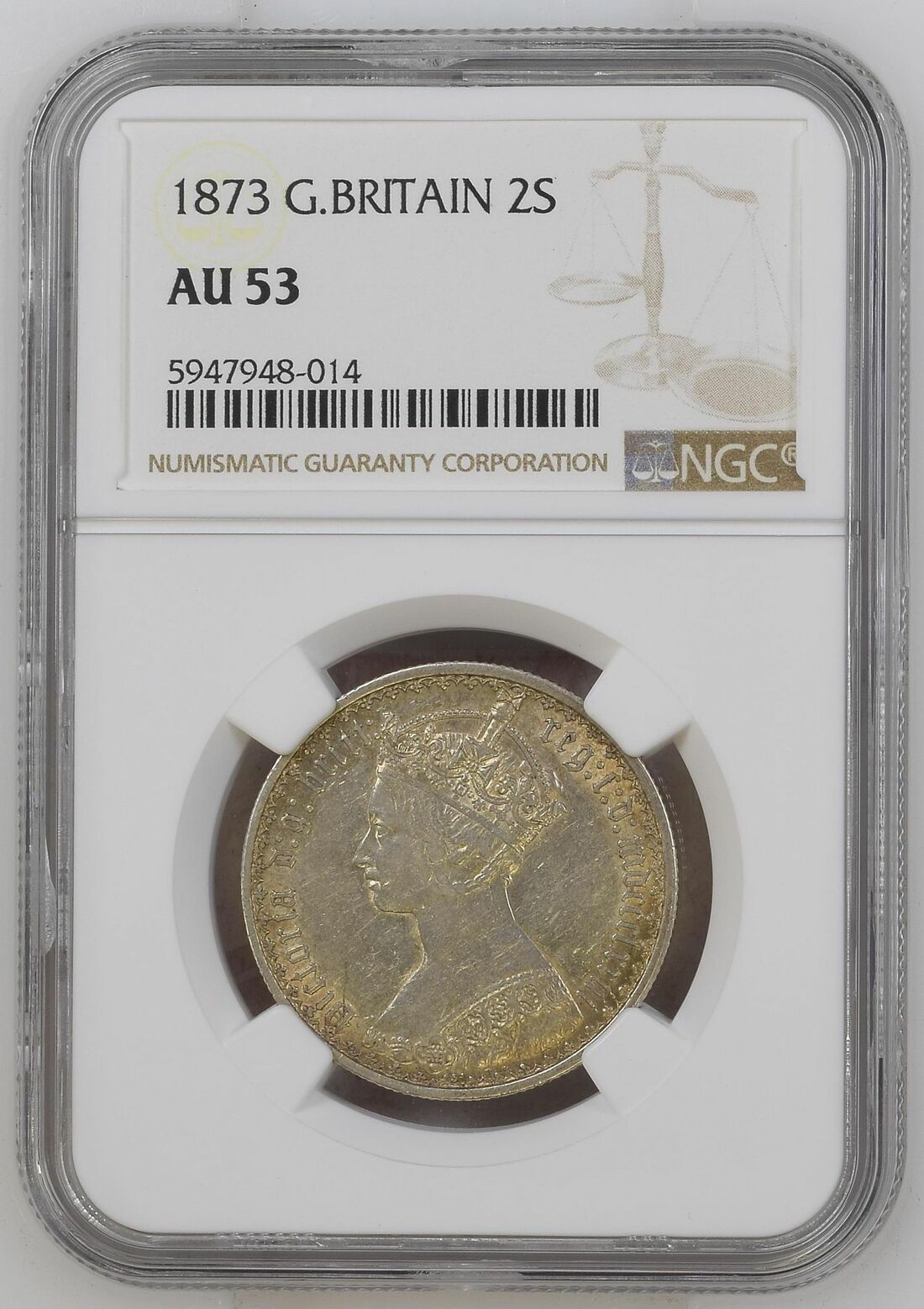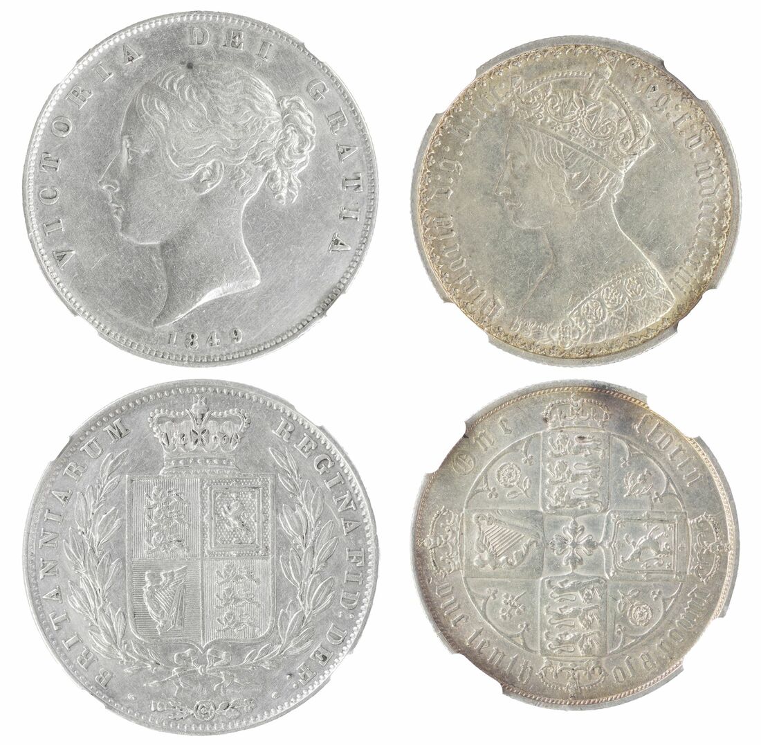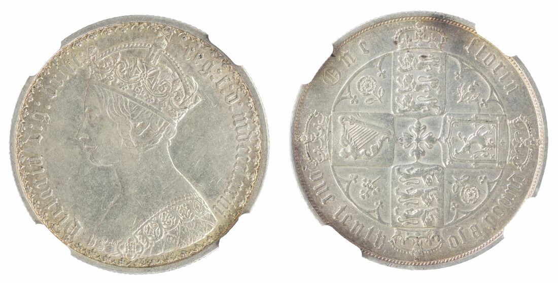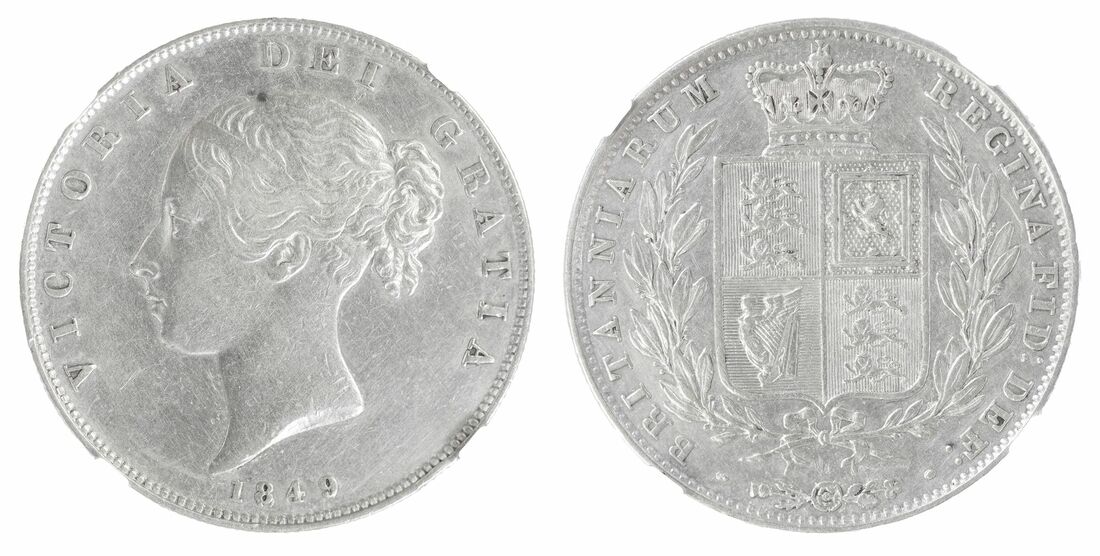 (x) NGC AU | Victoria (1837-1901), 'Young Head' Halfcrown, 1849, small date, type A4, no initials on truncation, rev. eight strings to harp, edge milled, 7h (Davies 574; ESC 683; Bull 2732 [R]; S.3888), cleaned, slightly pitted, otherwise near very fine, in NGC holder, graded AU DETAILS ~ HARSHLY CLEANED (Cert.#6652915-005); and NGC AU53 | Victoria (1837-1901), 'Gothic' Florin, MDCCCLXXVIII [1873], Type B3, Gothic bust left, rev. crowned shields cruciform, emblems in angles, 7h (ESC 841; Bull 2879; S.3893), bagmarked, yet with some lustre to the reverse, very fine / bold very fine, in NGC holder, graded AU53 (Cert.#5947948-014) (2)