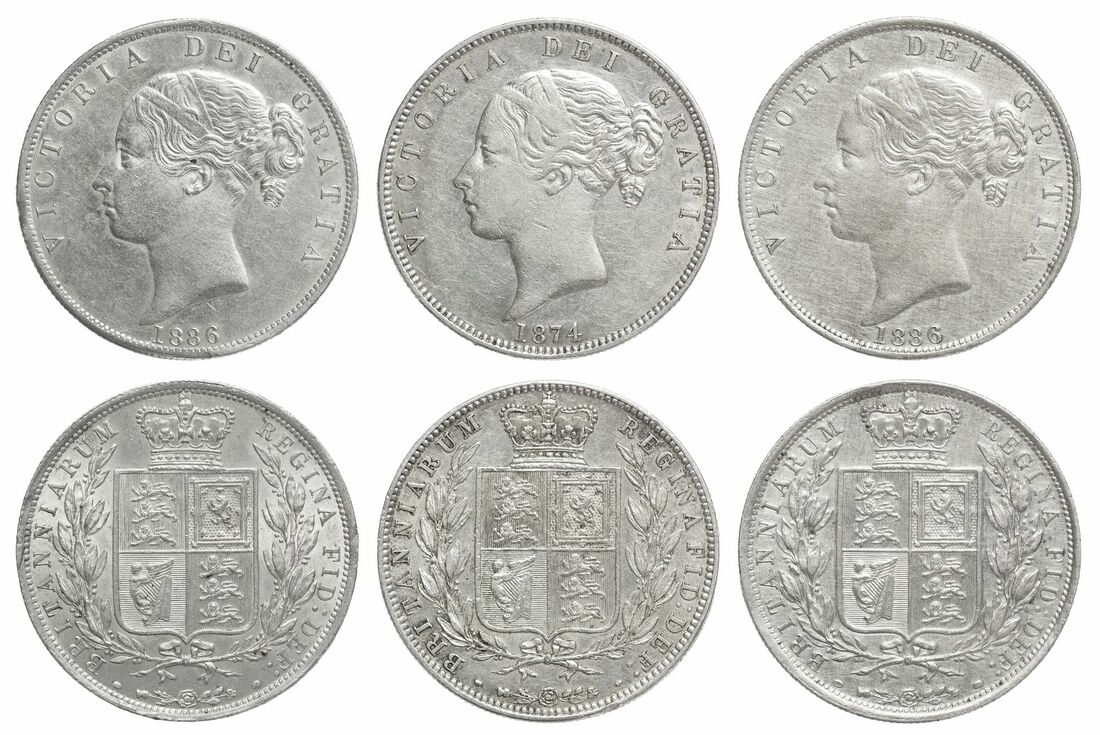 Victoria (1837-1901), 'Young Head', Halfcrowns, 1874; 1886 (2), Type A5, London, young head left, of inferior workmanship, rev. crowned shield within wreath, edge milled, 14.12g, 6h; 14.07g, 6h; 14.14g, 6h (Pywell-Phillips 578, 582; ESC 692, 715; Bull 2741, 2767; S.3889), all wiped and lightly bagmarked, nonetheless with residual lustre to the reverses, more so to once of the 1886's, very fine (3)