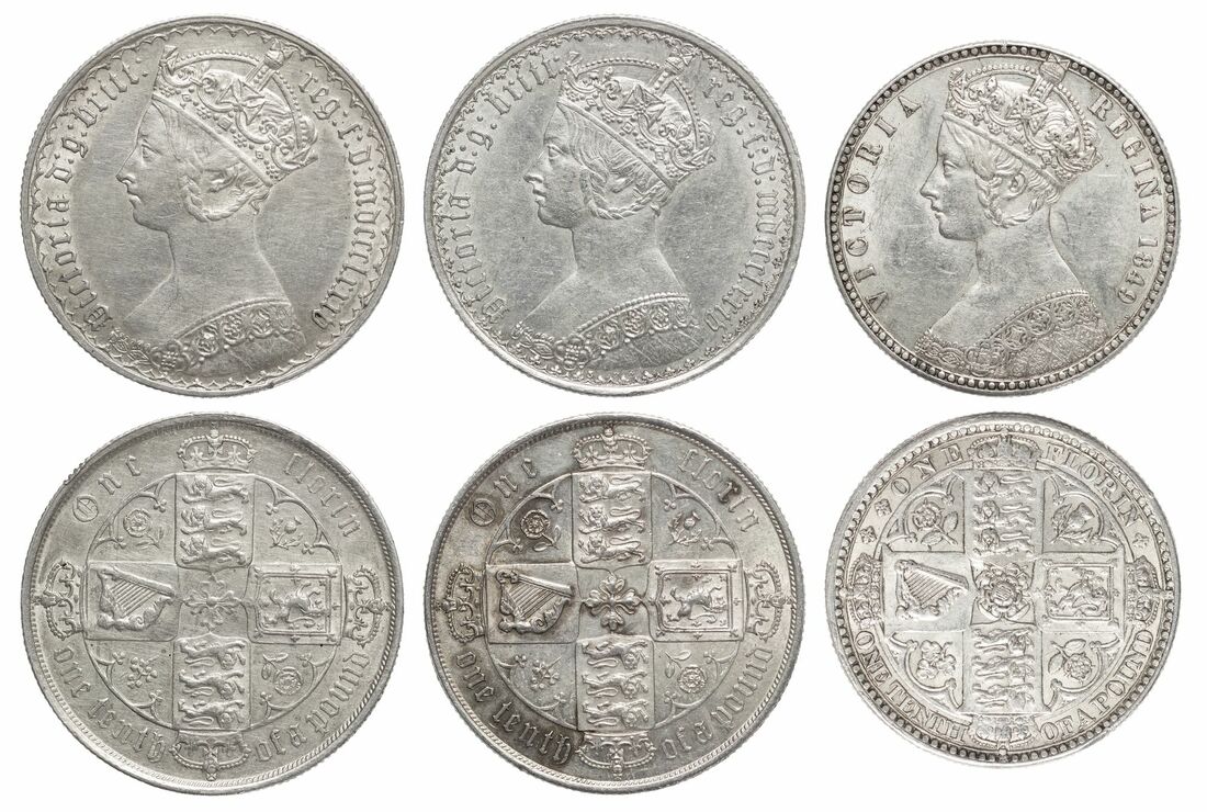 Victoria (1837-1901), 'Godless' Florin, 1849, crowned 'Gothic' bust left, W.W. after date, rev. crowned shields cruciform, emblems in angles, edge milled, 11.28g, 6h (Pywell-Phillips 585; ESC 802; Bull 2815; S.3890), lightly contact marked, otherwise very fine; and 'Gothic' Florin, 1874, Type B3, crowned bust left, rev. four crowned shields cruciform, milled edge, 11.30g, 6h (Pywell-Phillips 600; Bull 2881; ESC 843; S.3893); and another, 1885, Type B8, similar, 11.30g, 6h (Pywell-Phillips 610; ESC 861; Bull 2909; S.3900), minor contact marking to the obverses, the reverses with much lustre, very fine / good very fine (3)