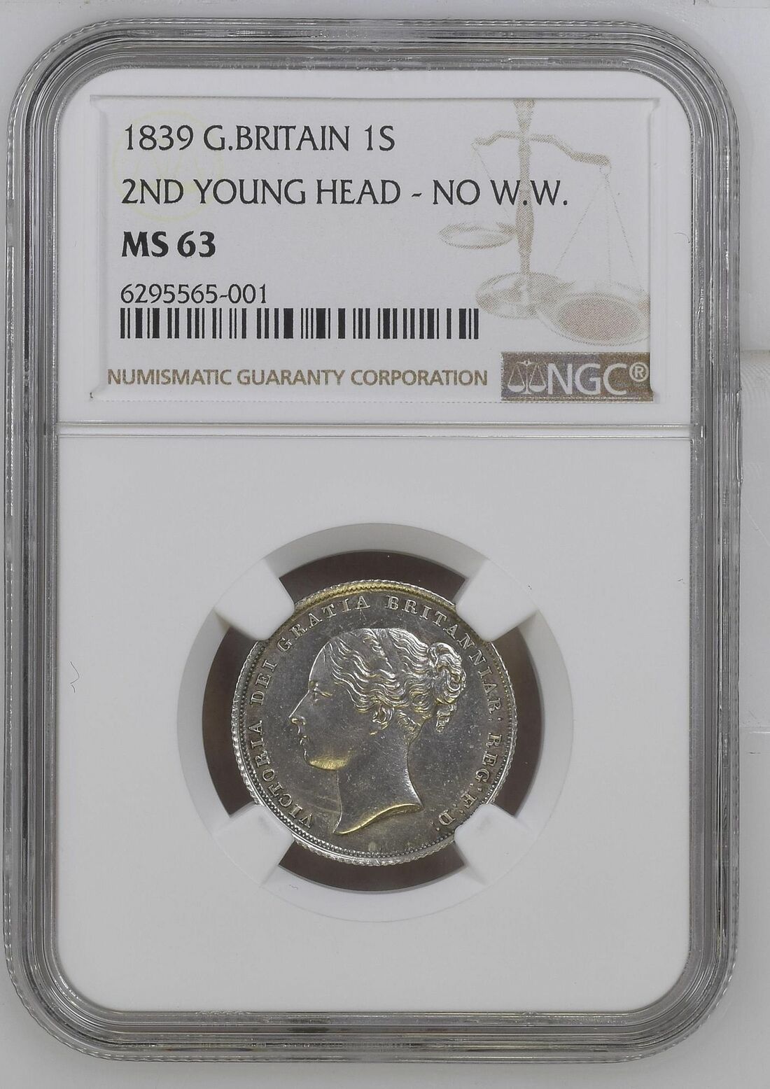 NGC MS63 | Victoria (1837-1901), Shilling, 1839, Type A³, second young head left, plain on truncation, rev. coin alignment, crowned value in wreath, edge milled, 5.65g, 6h (Bull 2979; ESC 1283; S.3904), lightly wiped and bright, otherwise brilliant with a hint of retoning, a small die flaw across fillet, otherwise a bold extremely fine, in NGC holder, graded MS63 (Cert. #6295565-001)