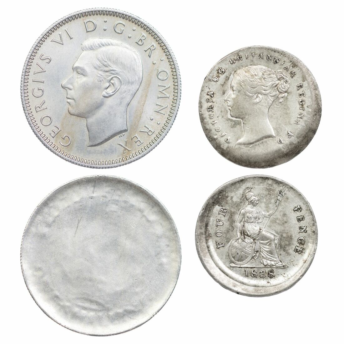 Mint Errors (2) | Victoria, (1837-1901), 'Off-Centre Strike' Groat, 1838, young head left, rev. Britannia seated right, milled edge, 1.87g, 12h, (ESC 1930; Bull 3319; S.3913) struck off centre on flan, interesting error, with flashy blue toning, lustrous, very fine; also George VI (1936-1952), Error 'Scottish' Shilling, 19[--], bare head left, rev. Scottish reverse, milled edge, 5.67g, 12h (S.4083), die-capped, thus the reverse very weakly struck, hard to decipher any details or the date, otherwise very fine (2)