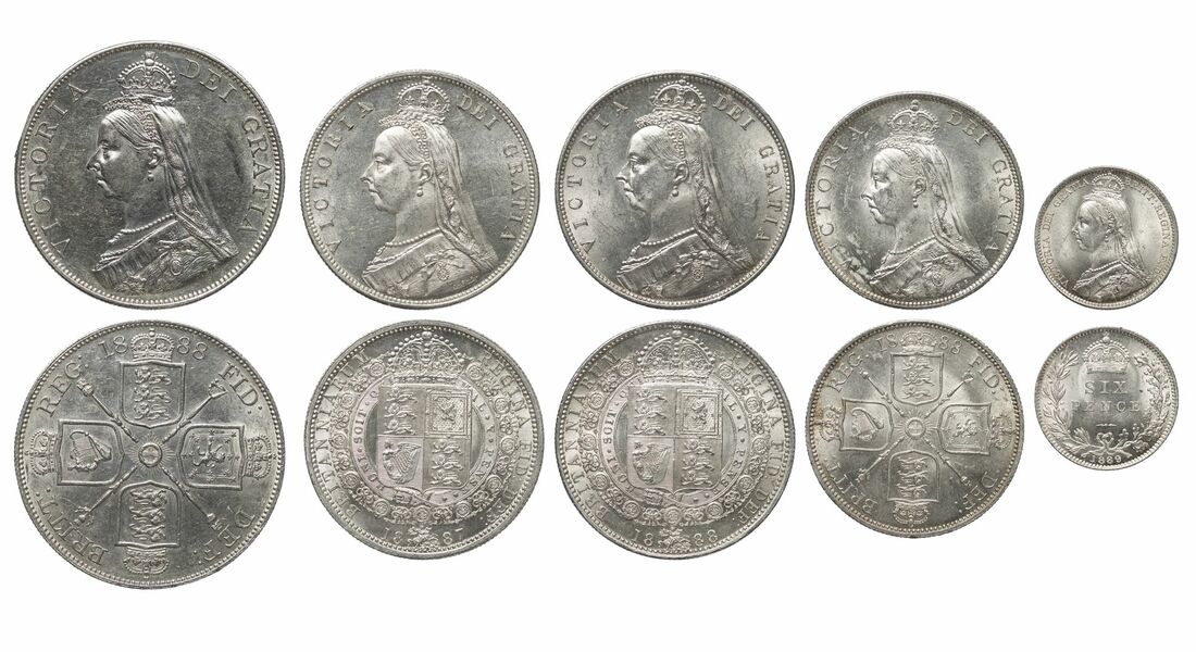 Collection of 'Golden Jubilee' Silver (5) | Victoria (1837-1901), Double-Florin, 1888, milled edge, 22.63g, 12h (ESC 397; Bull 2699; S.3923), lightly hairlined, with a bright and glossy brilliance to the obverse, extremely fine; and Halfcrowns (2), 1887; 1888, milled edge, 14.10g, 12h; 14.12g, 12h (ESC 719, 721; Bull 2771, 2773; S. 3924), lightly contact marked, otherwise with pleasing cartwheel lustres, extremely fine; and Florin, 1888, milled edge, 11.35g, 12h (ESC 868; Bull 2953; S.3925), some pinmarking but otherwise with a pleasing cartwheel lustre, extremely fine; and Sixpence, 1889, milled edge, 2.83g, 12h (ESC 1757; Bull 3279; S.3929), most pleasing extremely fine (5)