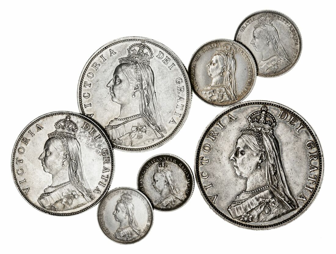 Victoria (1837-1901), 'Golden Jubilee' Double-Florin, 1887, Roman 1, milled edge, 12h, 22.63g (ESC 394; Bull 2695; S.3922), heavily pinmarked and wiped, otherwise brilliant-like and dark silver toned surfaces, very fine, the reverse better; and 'Golden Jubilee' Halfcrown, 1887, milled edge, 12h, 14.12g (ESC 719; Bull 2771; S.3924), lightly contact marked and some rub to the higher points, otherwise brilliant, bolder very fine, better in parts; and 'Golden Jubilee' Florin, 1887, milled edge, 12h, 11.29g (ESC 868; Bull 2953; S.3925), lightly contact marked, otherwise with a brilliance to the fields, extremely fine; and 'Golden Jubilee' Sixpence, 1891, milled edge, 12h, 2.81g (ESC 1759; Bull 3282; S.3929), with a full mint bloom, uncirculated; and 'Golden Jubilee' Sixpence, 1887, withdrawn type, milled edge, 12h, 2.83g (ESC 1752; Bull 3264; S.3928), wiped yet toned and lustrous, bold very fine; and 'Golden Jubilee' Threepence, 1887, milled edge, 12h, 1.40g (ESC 2096; Bull 3436; S.3931), with a full and pleasing lustre, uncirculated; and 'Golden Jubilee' Groat, 1888, milled edge, 12h, 1.86g (ESC 1956; Bull 3359), fine (7)