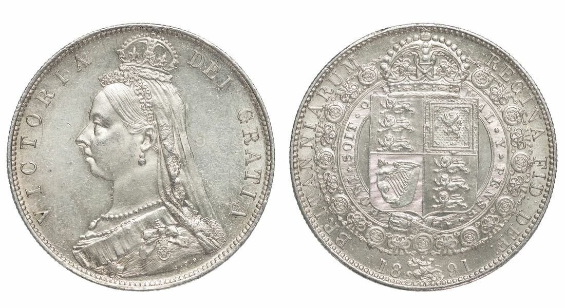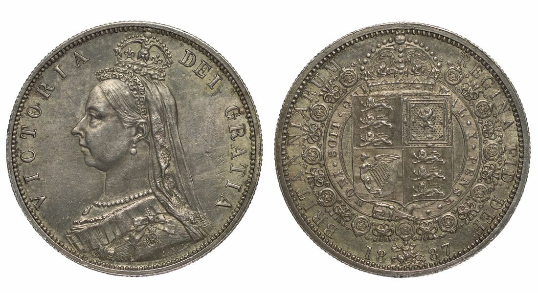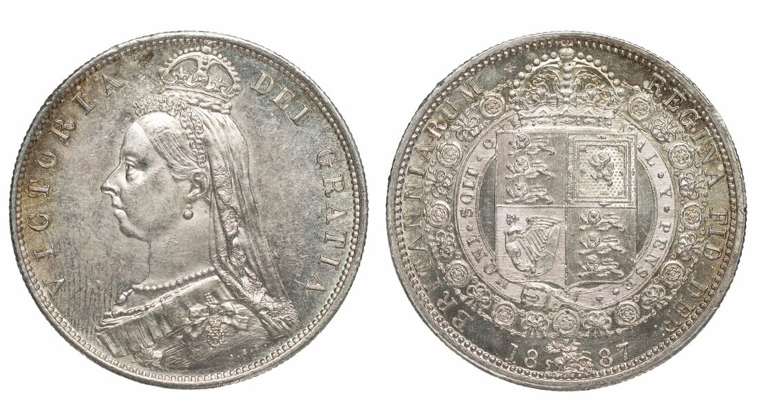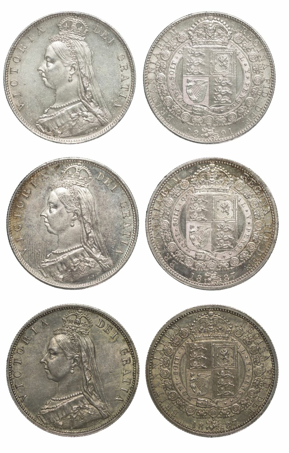 Victoria (1837-1901), 'Golden Jubilee' Halfcrowns, 1887 (2), crowned Jubilee bust left, rev. crowned shield in Garter, milled edge, 14.13g, 12h; 14.15g, 12h (Pywell-Phillips 744; ESC 719; Bull 2771; S.3924), the first lightly bagmarked, with a dark tone, very fine, the second with some minor pin and fingermarking, to otherwise near brilliant fields, toned, extremely fine; and another, 1891, 14.11g, 12h (Pywell-Phillips 744; ESC 724; Bull 2776; S.3924), pinmarked, lightly toned to highly lustrous surfaces, good very fine (3)