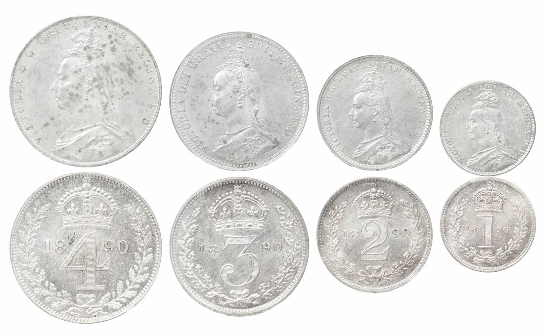 Victoria (1837-1901), 'Golden Jubilee' Maundy Set, 1890, 'Jubilee' head left, rev. crowned mark of value, edges plain (ESC 2505 [S]; Bull 3548; S.3932), brilliance in the field, some toning spots but otherwise extremely fine, with case