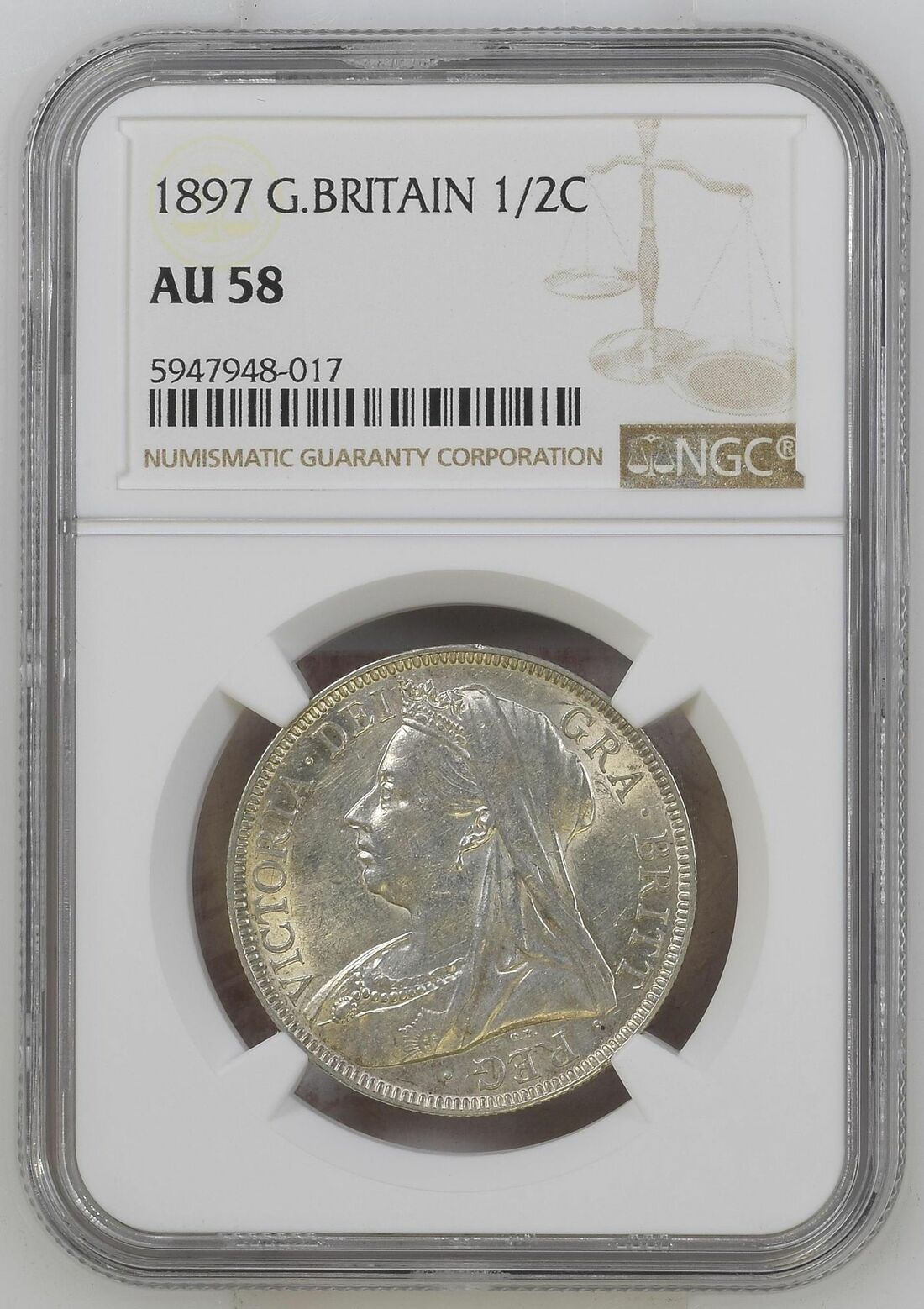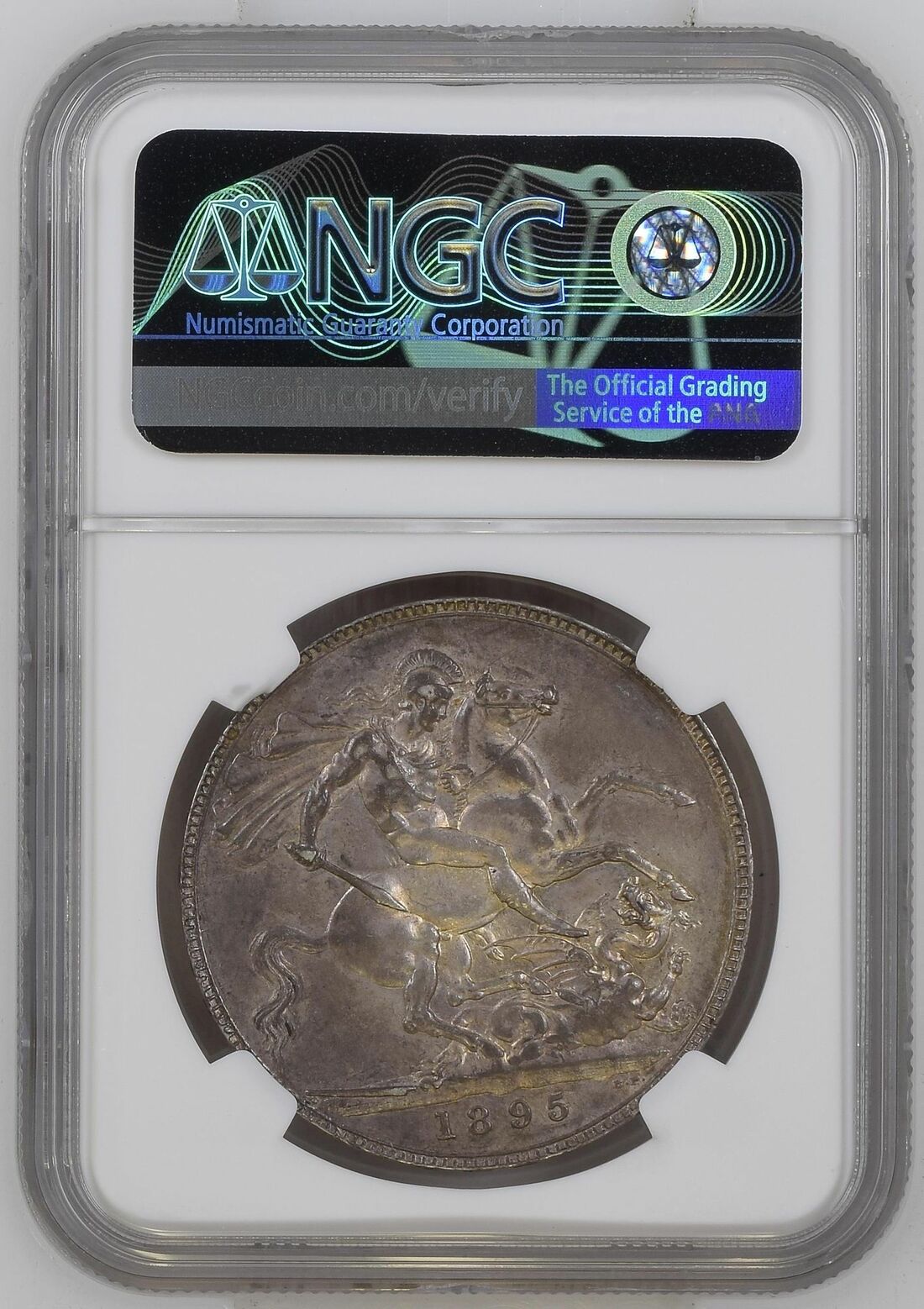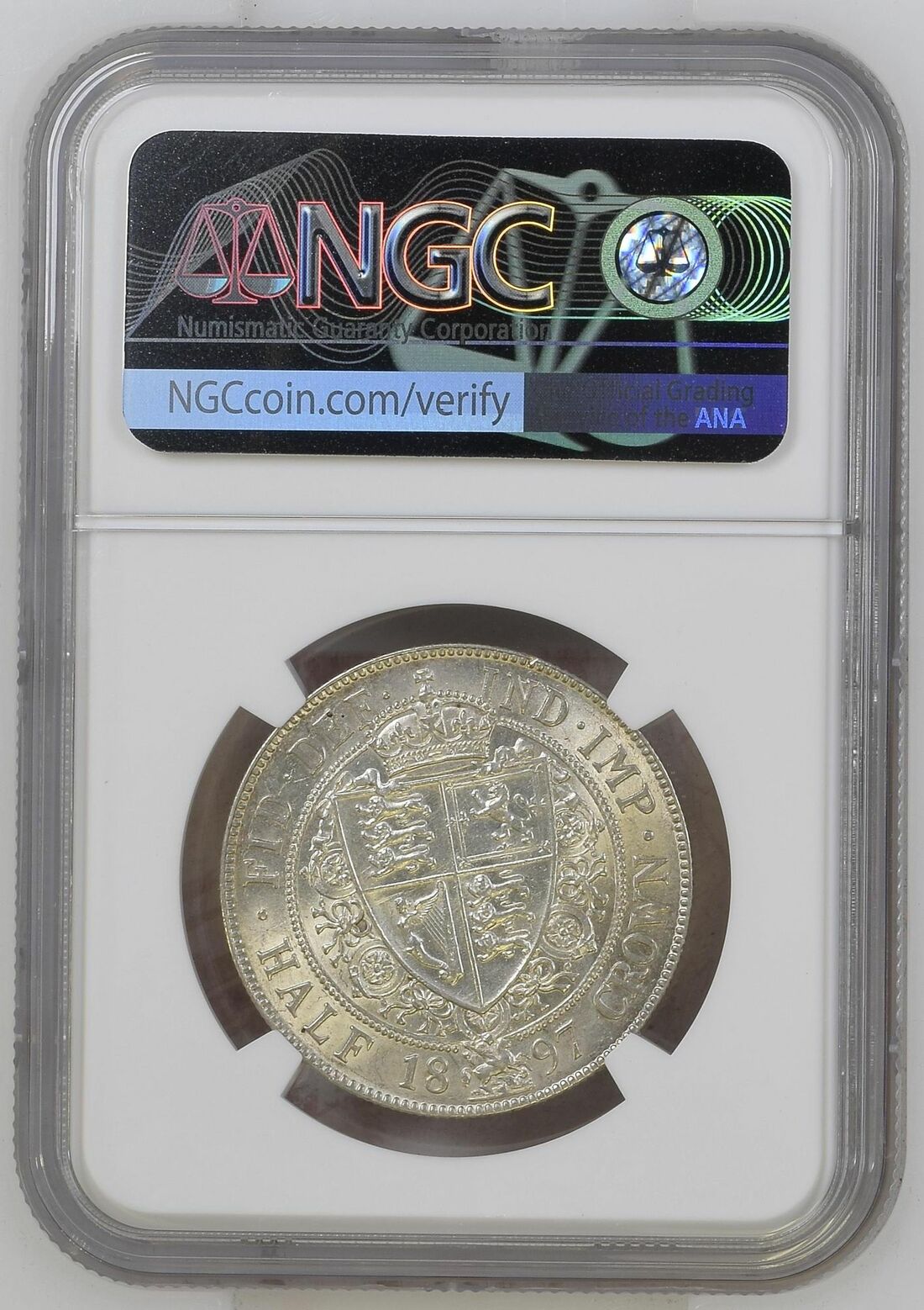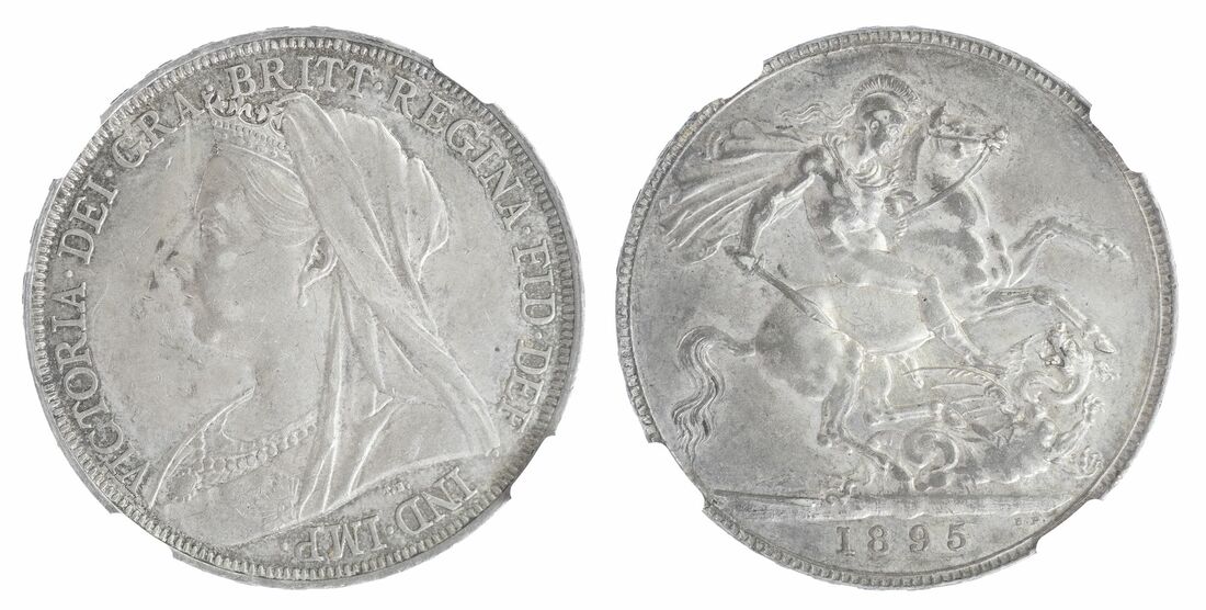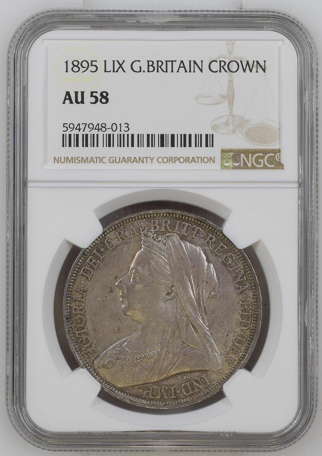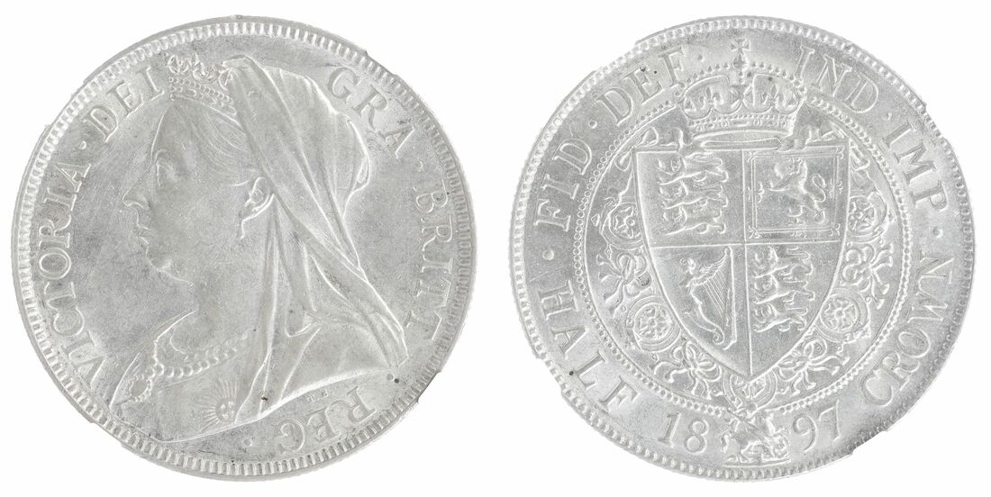 (x) NGC AU58 | Victoria (1837-1901), 'Old Head' Crown, 1895 LIX, 'Widow' or veiled head left, rev. St George and Dragon, raised lettered edge upwards, 12h (Bull 2599; ESC 309; S.3937), some rub to the higher points, some contact marking, otherwise with an ashy tone, very fine, in NGC holder, graded AU58 (Cert.#5947948-013); and NGC AU58 | Halfcrown, 1897, head left, rev. crowned spade shield within collar, edge milled, 12h (Bull 2783; ESC 731; S.3938), bright wiped with contact marks, otherwise residually lustrous, conservatively graded, good very fine, in NGC holder, graded AU58 (Cert.#5947948-017) (2)