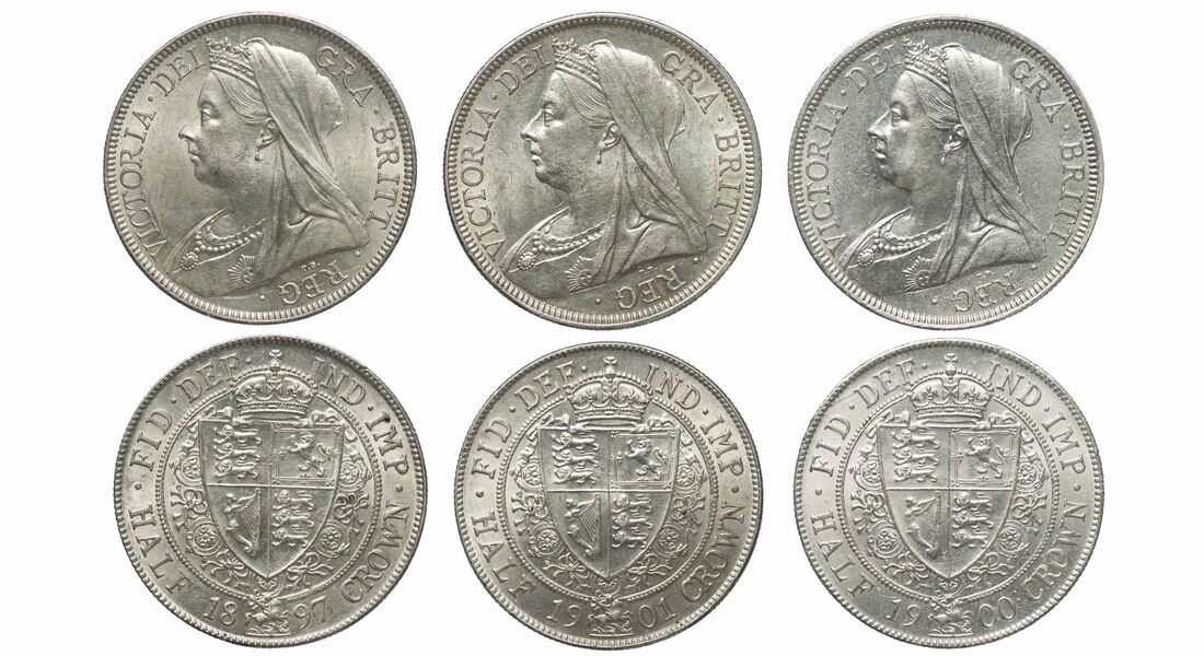 Victoria (1837-1901), 'Old Head' Halfcrowns (3), 1897; 1900; 1901, veiled bust left, rev. crowned shield in Garter, milled edge, 14.12g, 12h; 14.10g, 12h; 14.08g, 12h (ESC 731, 734, 735; Bull 2783, 2786, 2787; S.3938), some very minor pinmarking, otherwise with pleasing mint fresh surfaces, extremely fine to uncirculated (3)