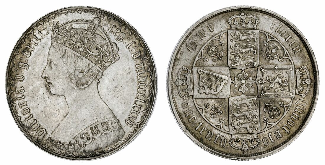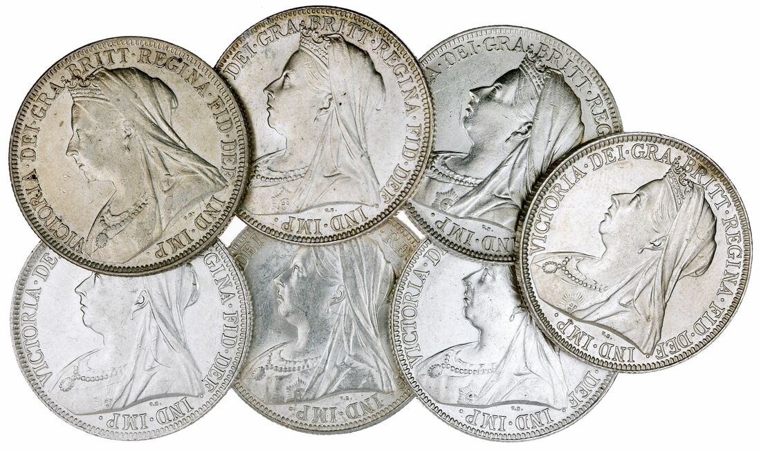 Victoria (1837-1901), 'Old Head' Florin, 1893, veiled bust left, rev. crowned shields in Garter, milled edge, 12h, 11.25g; and, 1895, milled edge, 12h, 11.29g; 1896, milled edge, 11h, 11.32g; 1897, milled edge, 12h, 11.32g; 1899, milled edge, 12h, 11.28g; 1900, milled edge, 12h, 11.30g; 1901, milled edge, 12h, 11.31g (ESC 876; 879-881; 883-885; Bull 2962; 2965-2967; 2969; 2971-2972; S.3939), all with some contacting marking or hairlining to the obverses, yet the reverses mostly lustrous, very fine to extremely fine; and 'Gothic Florin', MDCCCLXXXV [1885], Type B8, Gothic bust left, rev. long arcs, crowned shields cruciform, emblems in angles, edge milled, 6h, 11.27g (ESC 861; Bull 2909; S.3900), some pitted marks to fields and rub to the higher points, otherwise dark toning in parts and residually lustrous, bolder very fine (8)