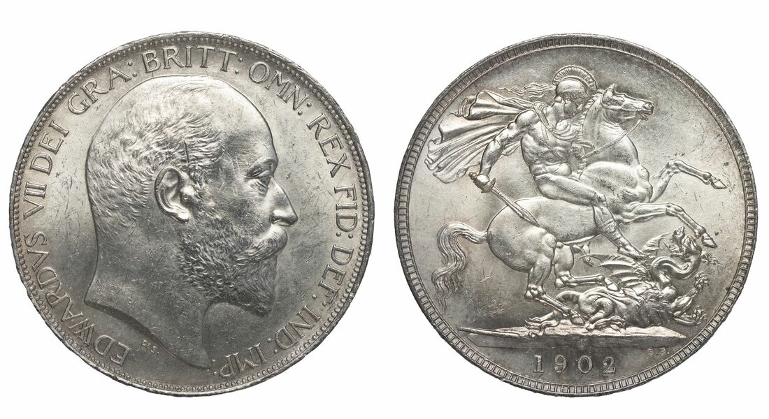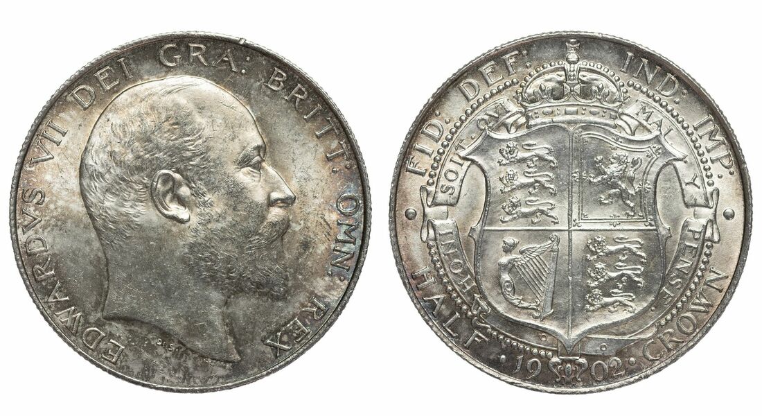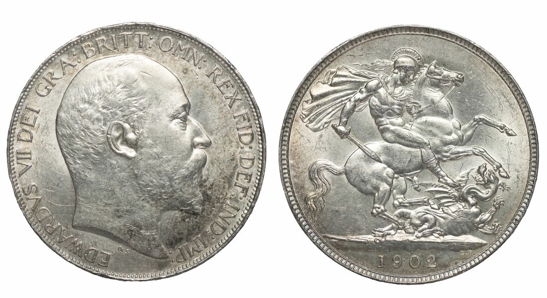 Edward VII (1901-1910), Crown, 1902 II, bare head right, rev. St George and Dragon, upwards lettered edge, 28.26g, 12h (ESC 361; Bull 3560; S.3978), wiped, pinmarked at the neck and other small scratches to face, nevertheless lustrous to the reverse, very fine / about extremely fine; and another, upwards lettered edge, 28.30g, 12h (ESC 361; Bull 3560; S.3978), pinmarked and scratched, more so on the reverse, toned with gold and purple hues, yet with a pleasing mint lustre to the reverse, extremely fine; and Halfcrown, 1902, bare head right, rev. crowned shield in Garter, edge milled, 14.10g, 12h (ESC 746; Bull 3567; S.3980), minor friction marks to the obverse, mottled and reddish toning throughout, but especially on the obverse, lustrous, extremely fine (3)