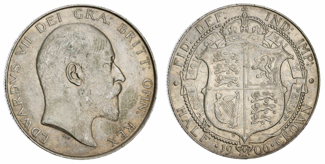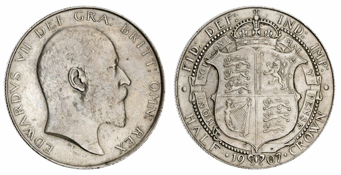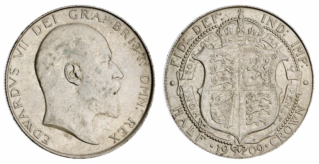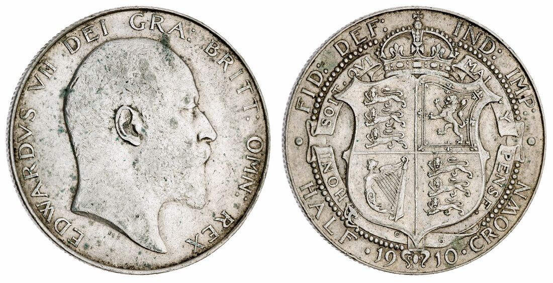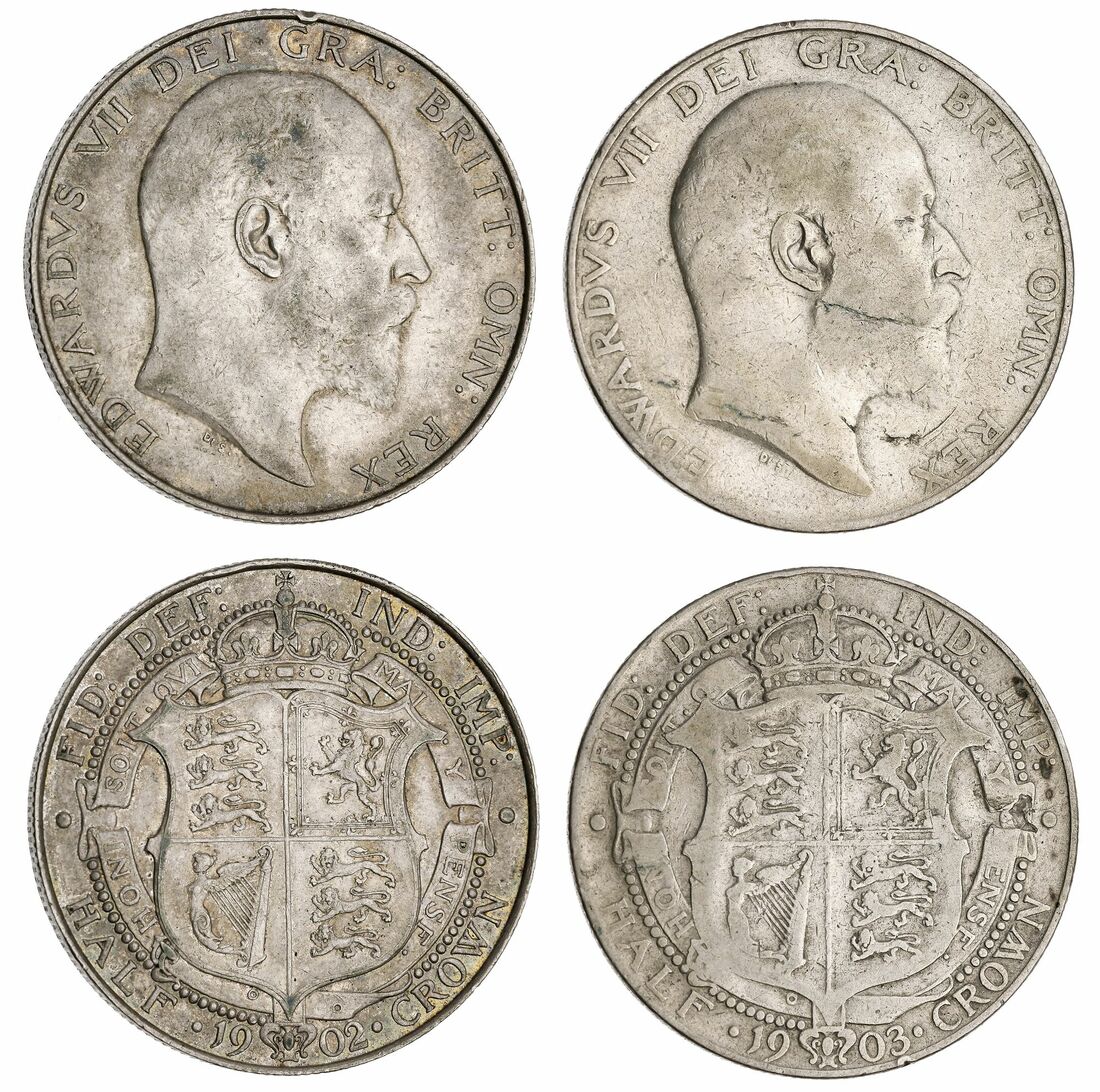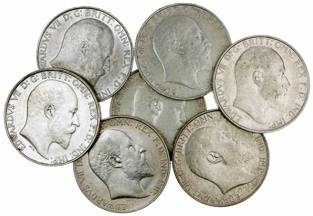 Edward VII (1901-1910), Halfcrown, 1902, bare head right, rev. crowned shield in Garter, edge milled, 14.09g, 12h (ESC 746; Bull 3567; S.3980), lightly bagmarked and bruised to the edges, some verdigris, otherwise toned, about very fine; another, Halfcrown, 1903, similar, edge milled, 13.81g, 12h (ESC 748; Bull 3569 [R2]; S.3980), cleaned and heavily contact marked, more so below the chin, fine, yet one of the key dates in the series; Halfcrown, 1905, bare head right, rev. crowned shield in Garter, edge milled, 14.00g, 12h (ESC 750 [R2]; Bull 3571; S.3980), cleaned and contact marked, some hints of verdigris, otherwise a bolder fine, the famous key date in series; Halfcrown, 1906, bare head right, rev. crowned shield, edge milled, 14.12g, 12h (Bull 3572; ESC 751; S.3980), lightly bagmarked and with some light verdigris to the surfaces, otherwise with a pleasing flashy tone to the fields, very fine; Halfcrown, 1907, bare head right, rev. crowned shield in Garter, edge milled, 14.12g, 12h (Bull 3573; ESC 752; S.3980), wiped and with a handful of bagmarks, otherwise lightly toned, about extremely fine; Halfcrown, 1909, bare head right, rev. crowned shield in Garter, edge milled, 14.12g, 12h (ESC 754, Bull 3575; S.3980), lightly contact marked and with some verdigris, otherwise with a pleasing residual lustre and light tone, nearing extremely fine; Halfcrown, 1910, bare head right, rev. crowned shield in Garter, edge milled, 14.06g, 12h (ESC 755; Bull 3576; S.3980), cleaned and bagmarked, with some verdigris, otherwise with hints of tone to the legends, very fine; 'Standing Britannia' Florins (7), 1902, bare head right, rev Britannia standing right, edge milled, 11.28g, 12h (ESC 909; Bull 3577; S.3981); another, 1903, similar, edge milled, 11.28g, 12h (ESC 921; Bull 3579; S.3981); another, 1904, edge milled, 11.24g, 12h (ESC 922; Bull 3580; S.3981); also, 1905, edge milled, 11.25g, 12h (ESC 923; Bull 3581 [R2]; S.3981), the key date; another, 1907, similar, edge milled, 11.19g, 12h (ESC 925; Bull 3583; S.3981); also, 1908, edge milled, 11.32g, 12h (ESC 926; Bull 3584; S.3981); lastly, 1909, edge milled, 11.29g, 12h (ESC 927; Bull 3585; S.3981), mostly bright and hairlined, some with verdigris, otherwise all largely lustrous to the peripheries, very fine (14)