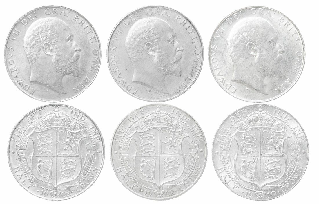 Edward VII (1901-1910), Halfcrowns (3), Matte Proof, 1902; Currency, 1902; Currency, 1910, bare head right, rev. crowned shield in Garter, edge milled, 14.14g; 14.18g; 14.15g, 12h (ESC 747, 755; Bull 3568, 3576; S.3980), the Proof previously wiped, yet with a pleasing residual matteness to the reverse, lightly toned, bolder very fine / extremely fine, the others with minor contact marking, yet lustorus, good very fine (3)