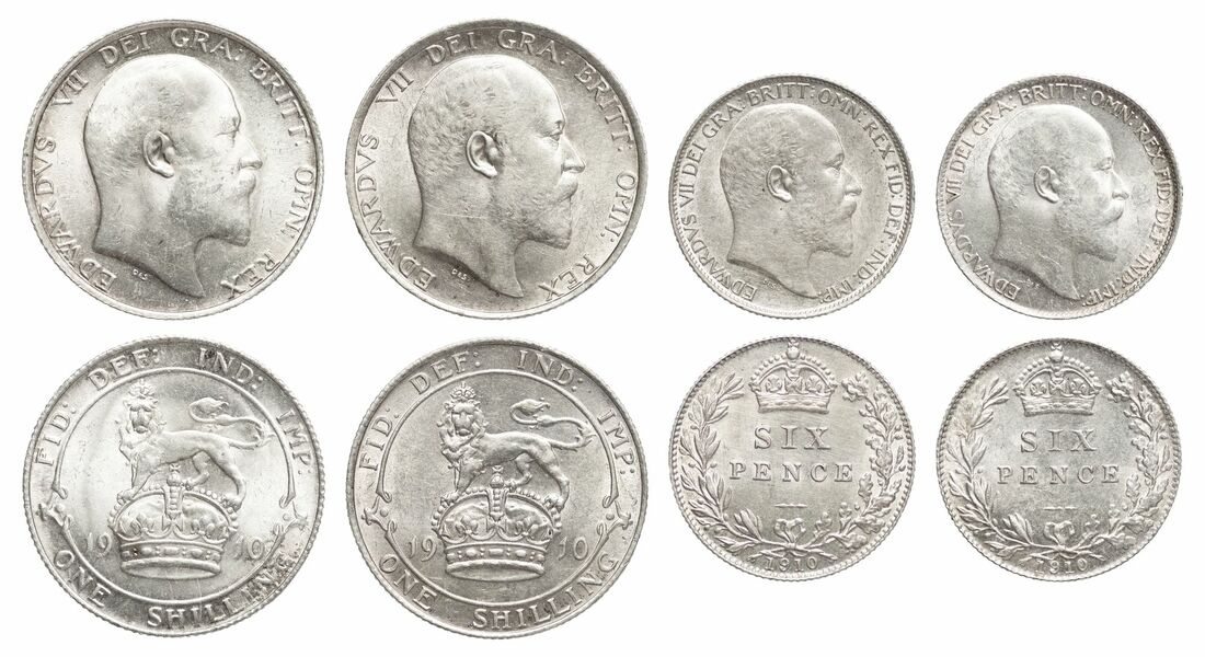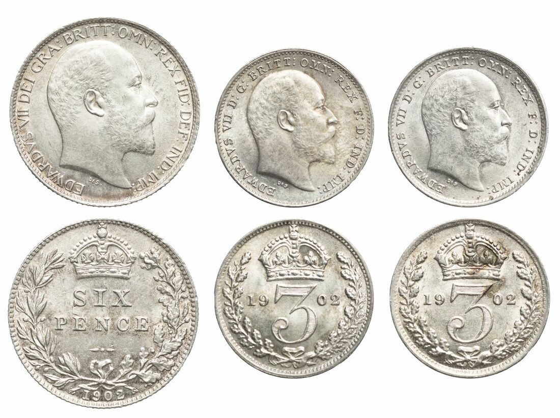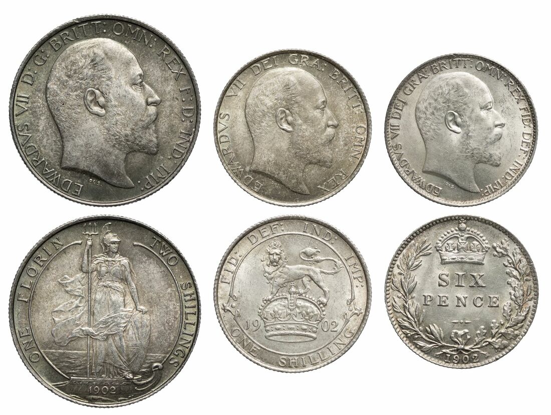 Edward VII (1901-1910), Florin, 1902, bare head right, rev. Britannia standing facing right, edge milled, 11.31g, 12h (ESC 919; Bull 3577; S.3981); Florin, 1903, bare head right, rev. Britannia standing facing right, edge milled, 11.32g, 12h (ESC 921; Bull 3579; S.3981), the first toned, both with a touch of wear to highest points, lustrous, good very fine; Shilling, 1902, bare head right, rev. lion atop crown, edge milled, 5.64g, 12h (ESC 1410; Bull 3587; S.3982); Shilling, 1910 (2), bare head right, rev. lion atop crown, edge milled, 5.66g, 12h; 5.64g, 12h (ESC 1419; Bull 3596; S.3982), the first toned and lustrous, extremely fine, the others lustrous, very good very fine; Sixpences, 1902 (2), bare head right, rev. crowned denomination within wreath, edge milled, 2.83g, 12h; 2.83g, 12h (ESC 1785; Bull 3597; S.3983); Sixpences, 1910 (2), bare head right, rev. crowned denomination within wreath, milled edge, 2.82g, 12h; 2.82g, 12h (ESC 1794; Bull 3606; S.3983), all very fine or better; and Threepences, 1902 (2), plain edge, 1.40g, 12h; 1.40g, 12h (ESC 2114; Bull 3617; S.3984), toned and lustrous, very fine and extremely fine (11)