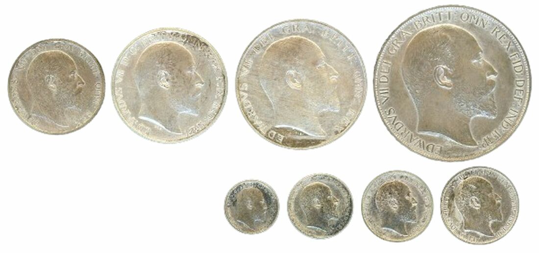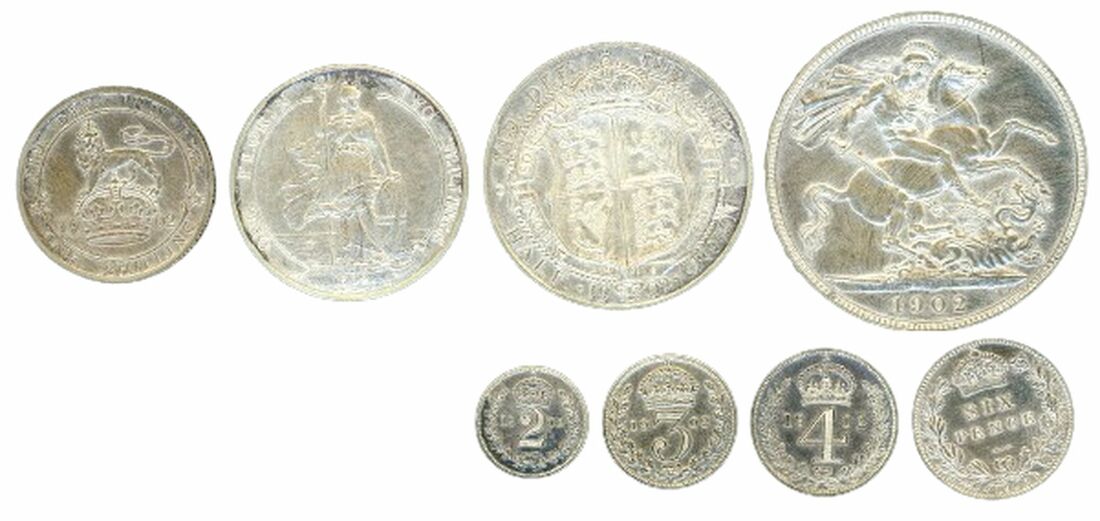 Edward VII (1901-1910), Incomplete Coronation Matte Proof Silver for 'Short Set', 1902 (8), Crown to Sixpence, with Maundy Fourpence; Threepence and Twopence (cf. S.PS10), with full and attractive white-matte surfaces, as struck (8)