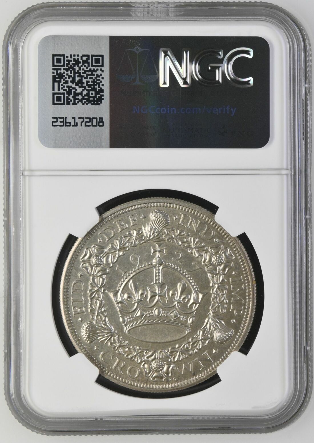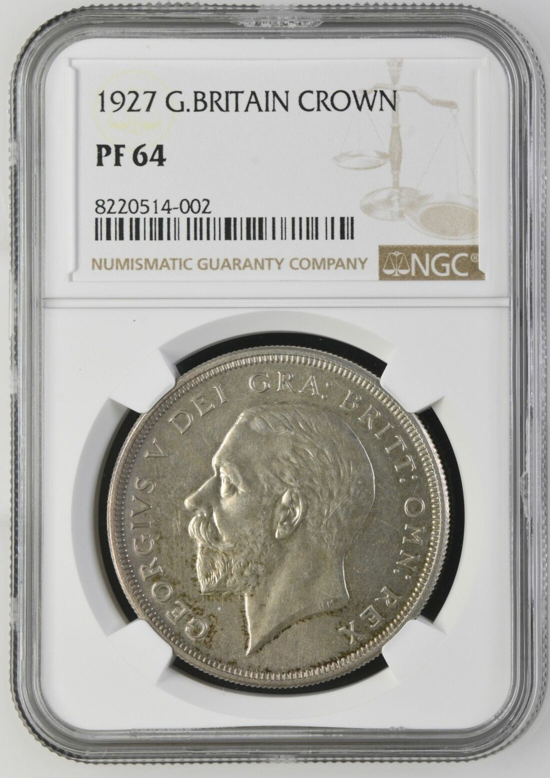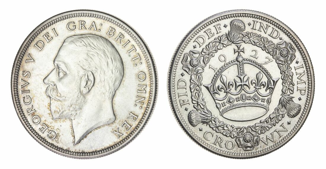 NGC PF64 | George V (1910-1936), 'Wreath' Proof Crown, 1927, bare head left, rev. crown within wreath, edge milled, 28.26g, 12h (ESC 367; Bull 3631; S.4036), some toning about the chin, otherwise the reverse still with much flashiness to the fields and toned, good extremely fine, one of only 15,030 struck, in NGC holder graded PF64 (Cert.#8220514-002)