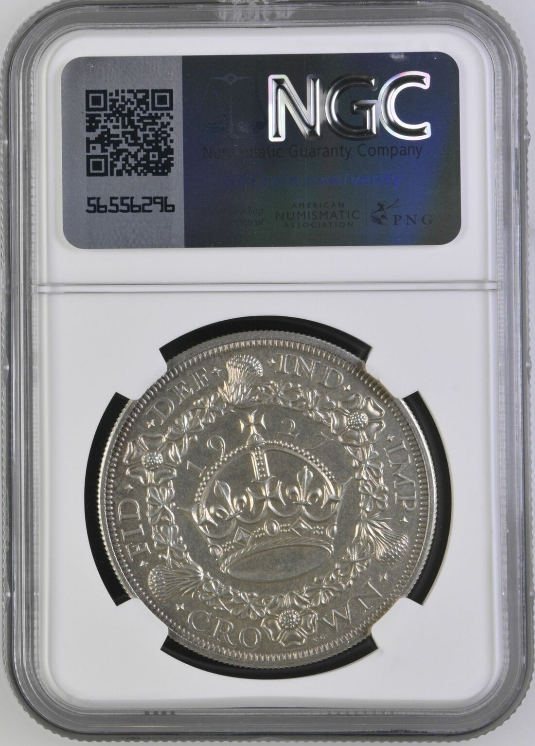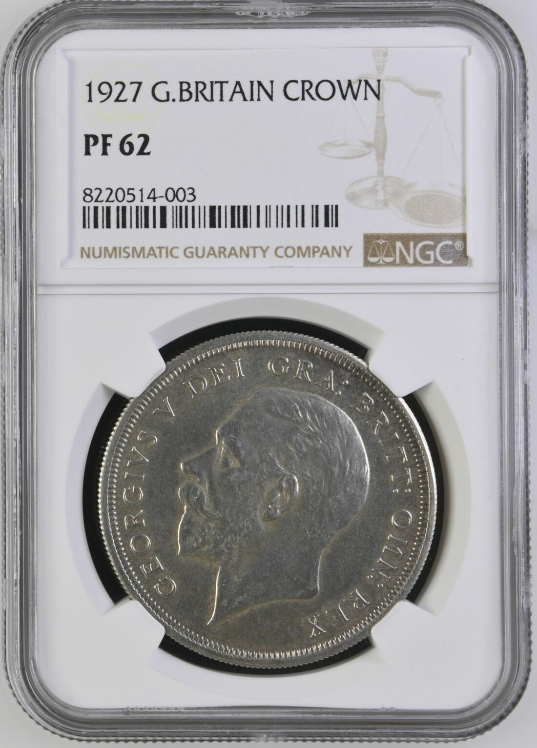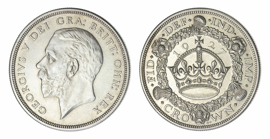 NGC PF62 | George V (1910-1936), 'Wreath' Proof Crown, 1927, bare head left, rev. crown within wreath, edge milled, 28.18g, 12h (ESC 367; Bull 3631; S.4036), much brilliance to the fields, with a light tone, about extremely fine, one of only 15,030 struck, in NGC holder graded PF62 (Cert.#8220514-003)