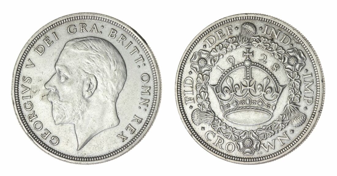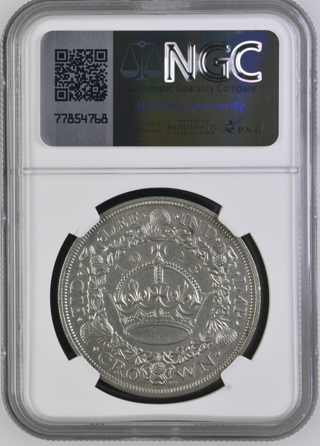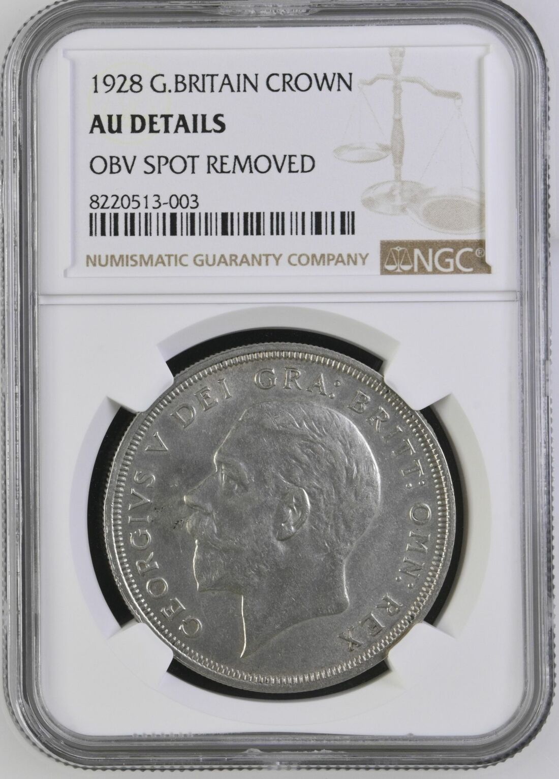 NGC AU | George V (1910-1936), 'Wreath' Proof Crown, 1927, bare head left, rev. crown within wreath, edge milled, 28.31g, 12h (ESC 368; Bull 3633; S.4036), bruised and scratched in front of portrait, due to removal of flyspeck, otherwise much brilliance to the fields and toned, a bolder very fine, one of only 9,034 struck, in NGC holder, graded AU Details ~ Obv Spot Removed (Cert.#8220513-003)