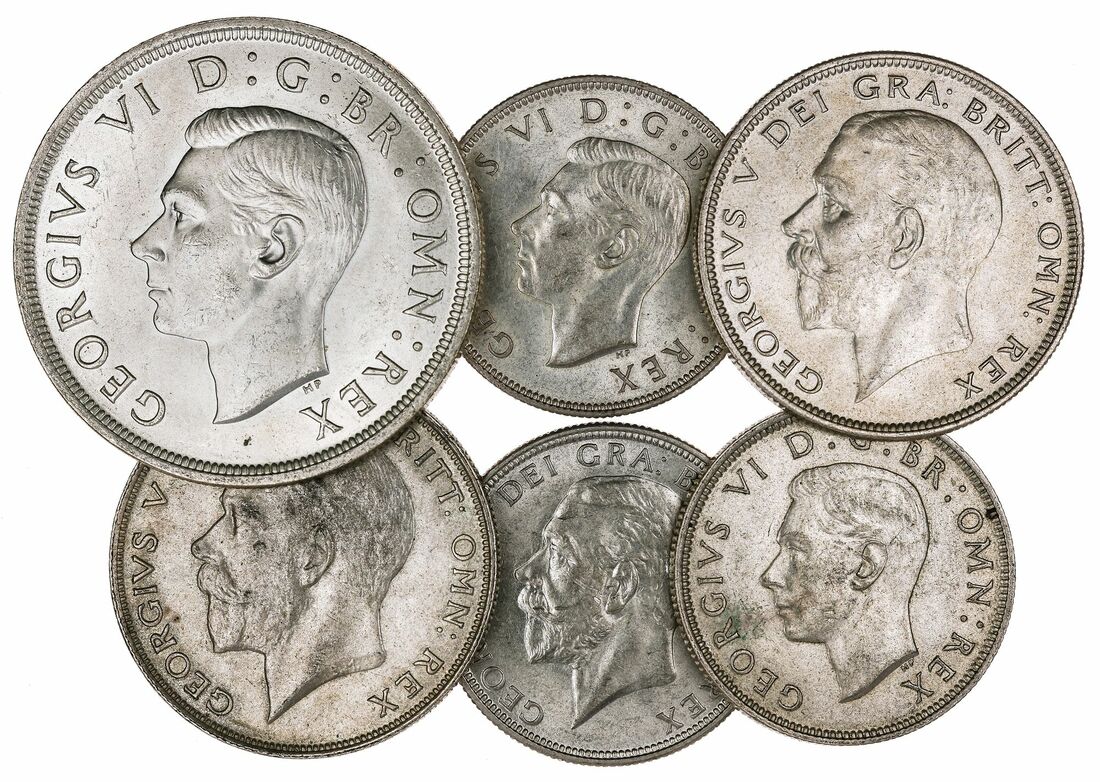 George V and George VI Silver (6) | George V (1910-1936), Halfcrown, 1923, edge milled, 14.14g, 12h (S.4021A); Halfcrown, 1933, edge milled, 14.06g, 12h (S.4037); Florin, 1936, edge milled, 11.36g, 12h (S.4038); George VI (1936-1952), 'Coronation' Crown, 1937, edge milled, 28.29g, 12h (S.4078); Florin, 1937 (2), edges milled, 11.28g, 12h; 11.30g, 12h (S.4081), some light pinmarking to all and rub to the highest points of the 1923, otherwise all mostly lustrous, wholesome very fine (6)