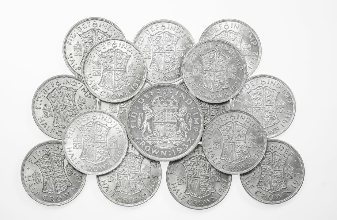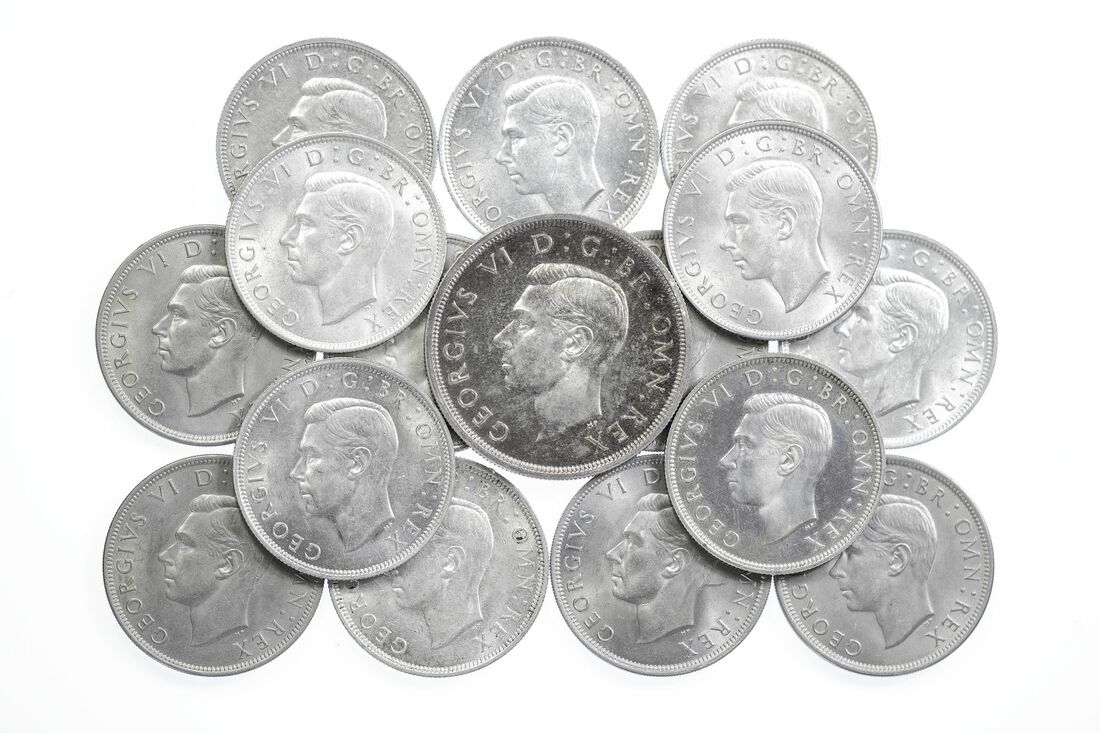 George VI (1936-1952), 'Coronation' Proof Crown, 1937, bare head left, rev. crowned arms with supporters, edge milled, 28.16g, 12h (ESC 393; Bull 4021; S.4079), the obverse toned in parts, otherwise with a full brilliance, nearing as struck; and Halfcrowns (15), Proof 1937; 1937; 1938; 1939; 1941; 1942; 1943; 1944; 1945; 1946; 1947; 1948; 1949; 1950; 1951, bare head left, rev. shield, milled edges (ESC 786; 787; 788; 789; 791; 792; 793; 794; 795; 796; 797; 798; 798A; 798B; 798D; S.4080, 4101- 4108), mostly with a full and pleasing lustre, extremely fine to uncirculated, the Proof Crown toned to the obverse and with some hairline whisps, otherwise brilliant, the Proof Halfcrown with some frostiness and the occasional fly-away hairline to brilliant fields, near uncirculated (16)
