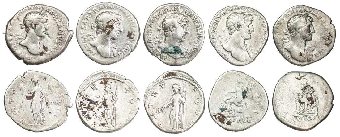 Roman Empire, Hadrian (AD 117-138), AR Denarii (5): i) Rome, struck 118, IMP CAESAR TRAIAN HADRIANVS AVG, laureate head right, drapery at far shoulder, rev. P M TR P COS II, Concordia seated left, holding patera and resting elbow upon figure of Spes, CONCORD in exergue, 2.97g (RIC 108; BMC 81), deposits to reverse, fine; ii) another, as before, rev. P M TR P COS II, Fortuna seated left, holding cornucopiae and rudder, FORT RED in exergue, 2.93g (RIC 114; BMC 69), spots of verdigris and corrosion, overall about fine; iii) another, as before,rev. P M TR P COS II, Aeternitas standing facing, head left, holding busts of Sol and Luna, AET-AVG across fields, 2.88g (RIC 130; BMC 57), some splits to the edges, some corrosion, slightly rough surfaces, good to fine, a relatively scarce type; iv) another, as before, rev. P M TR P COS III, Pax standing left, 3.05g (RIC 225; BMC 194 var. (bust)), spots of corrosion, good to fine; v) another, as before, 3.05g, verdigris to obverse, otherwise a nice portrait and residual lustre, near very fine; (5).