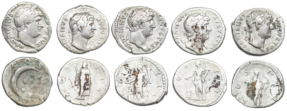 Roman Empire, Hadrian (AD 117-138), AR Denarii (5): i) Rome, HADRIANVS AVGVSTVS, laureate head right, slight drapery to far shoulder, rev. COS III, Spes advancing left, holding flower and raising skirt, 3.00g (RIC 714; BMC 417), good fine; ii) another, as before, rev. as before, Genius sacrificing at altar left, 2.70g (RIC 742; BMC 396), nice portrait, good fine to very fine; iii) another, as before, 2.93g, corrosion to portrait, about fine; iv) another, as before, laureate head right, rev. COS III, Diana standing right, holding bow and arrow, 2.98g (RIC 729; BMC 334 var. (bust))deposits, obverse near very fine, reverse about fine; v) another, as before, laureate head right, rev. COS III, crescent moon and seven stars, 3.10g (RIC 852; BMC 463), desirable type, lamentably softened, good to fine; (5)