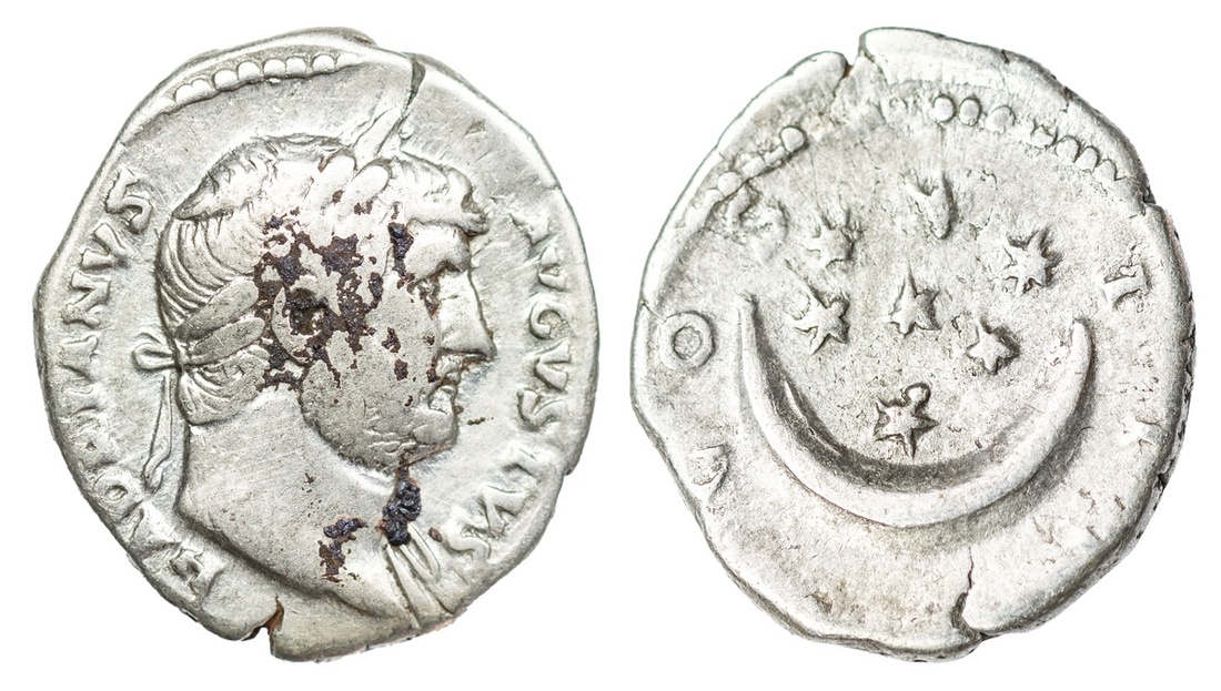 Roman Empire, Hadrian (AD 117-138), AR Denarius, Rome, struck c. 126-7, HADRIANVS AVGVSTVS, laureate head right, slight drapery to far shoulder, rev. COS III, crescent moon and seven stars, 3.02g (RIC 852; BMC 464), deposits to portrait, otherwise fine to good fine