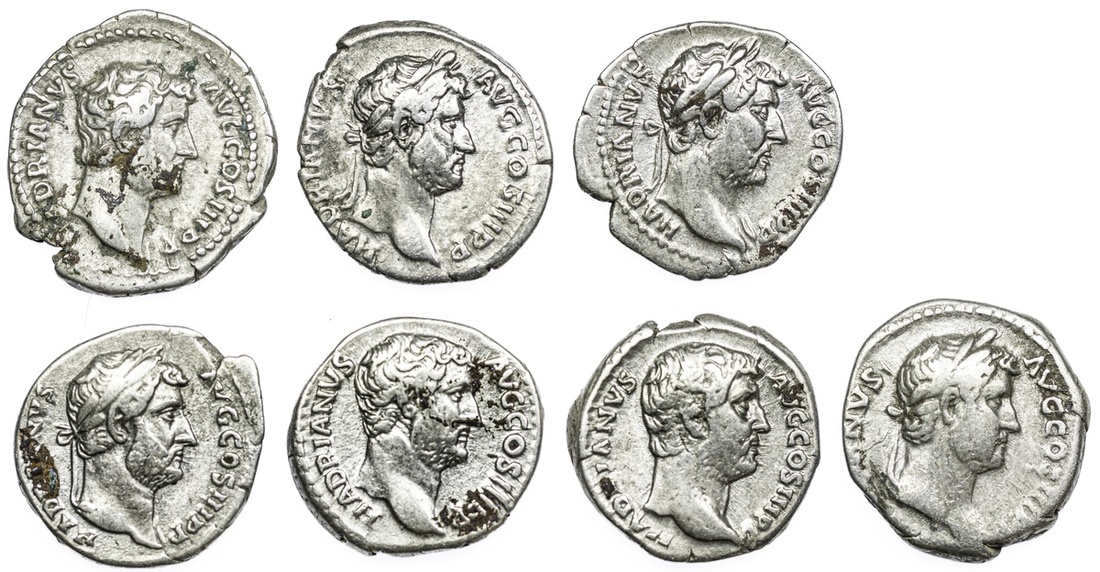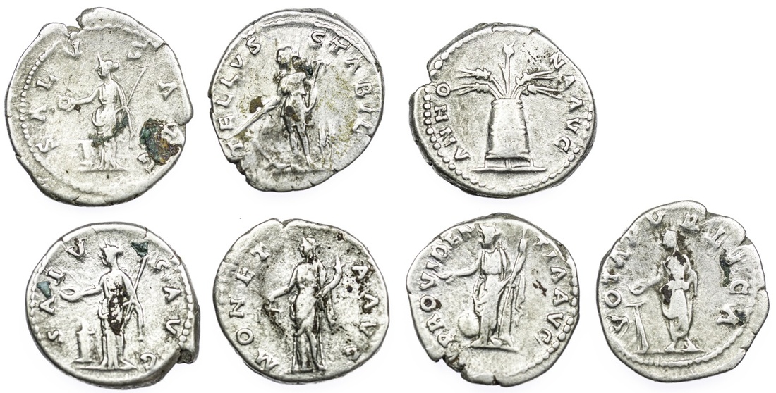 Roman Empire, Hadrian (AD 117-138), AR 'Descriptive' Denarii, struck c. 130-137 (7): i) Rome, HADRIANVS AVG COS III P P, laureate head right, rev. TELLVS STABIL, Tellus standing left, two corn-ears to right, 3.14g (RIC 2052; BMC 742), about fine; ii) another, as before, bare head right, rev. MONETA AVG, Moneta standing left, holding cornucopiae and scales, 3.14g (RIC 2224; BMC 678), residually lustrous, some deposits, about fine; iii) another, as before, laureate head right with slight drapery to far shoulder, rev. ANNONA AVG, Modius with corn-ears and poppy, 3.03g (RIC 2316; BMC 600 var. (bust)), good fine or better; iv) another, as before, laureate head right, rev. PROVIDENTIA AVG, Providentia standing left, 3.17g (RIC 2320; BMC 694), about fine; v) another, as before, rev. VOTA PVBLICA, Emperor giving sacrifice left over tripod, 3.02g (RIC 2325; BMC 780), good to fine; vi) another, as before, rev. SALVS AVG, Salus standing left, holding sceptre and patera before lit altar, 3.11g (RIC 2344; BMC 726), some verdigris, about fine; vii) another, as before, bare head right, 2.72g (RIC 2346; BMC 721), spots of verdigris and corrosion, near fine; (7).