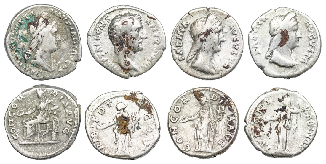Roman Empire, Hadrian (AD 117-138), AR Denarii (4) of Sabina (3) and Antoninus Pius, as Caesar (1): i) Rome, SABINA AVGVSTA HADRIANI AVG P P, draped bust right, wearing stephane, rev. CONCORDIA AVG, Concordia standing left with patera, arm on back of chair, 2.93g (RIC 2501; BMC 895), verdigris and wear to obverse, fair to good; ii) another, SABINA AVGVSTA, draped bust right, wearing stephane, rev. IVNONI REGINAE, Juno standing left with patera and sceptre, 2.81g (RIC 2550; BMC 940), some corrosion, good to fine; iii) another, as before, rev. CONCORDIA AVG, Concordia standing left, 3.40g (RIC 2571; BMC 929), about fine; iv) IMP T AEL CAES ANTONINVS, bare head of Antoninus Pius right, rev. TRIB POT COS, Concordia standing left, 2.62g (RIC 2725; BMC 1010), good to fine; (4).