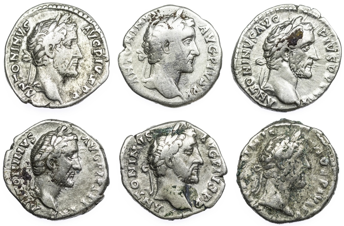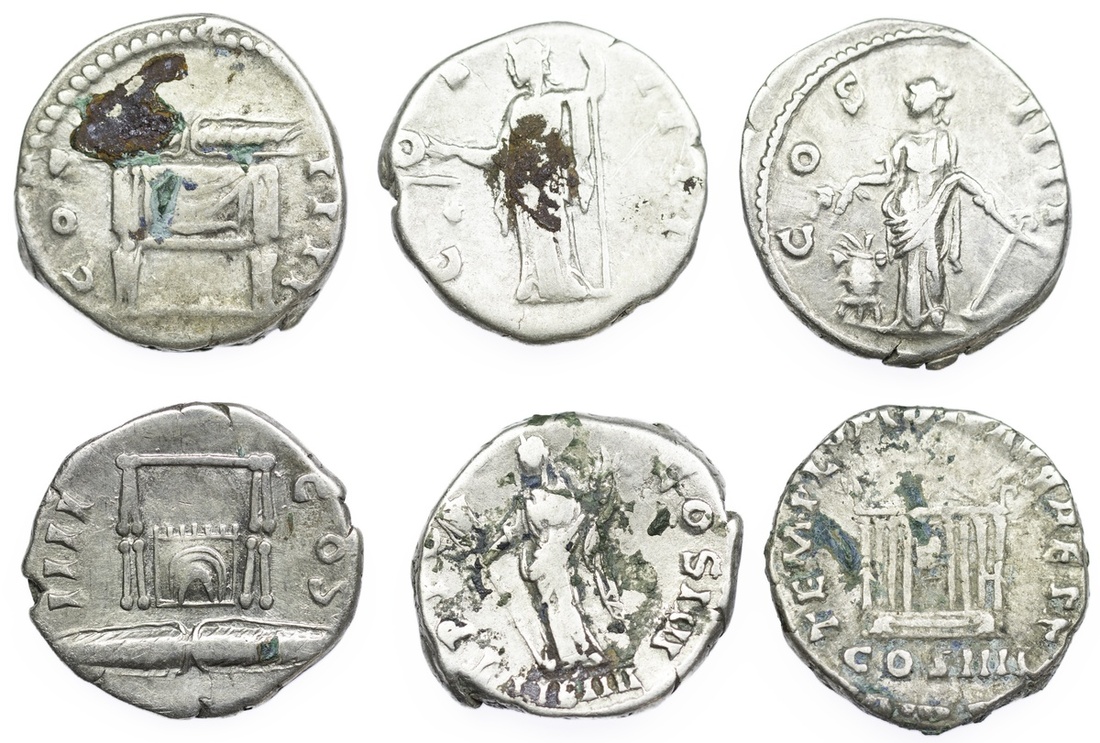 Roman Empire, Antoninus Pius (AD 138-161), AR Denarii (6): i) Rome, ANTONINVS AVG PIVS P P, bust laureate bust right, rev. COS IIII, Aequitas standing left, 2.61g (RIC 127c; BMC 512), corrosion to reverse, good; ii) another, as before, rev. COS IIII, thunderbolt on throne, 3.15g (RIC 137; BMC 536), corrosion and verdigris to reverse, good; iii) another, as before, but with obverse legend ANTONINVS AVG PIVS P P TR P, a possible plated copy, 2.54g (RIC 137 var.; BMC 536 var. [Spink XRF: Obverse: Ag 89.11%; Cu 6.84%; Zn 3.01%; Au 0.69%; Pb 0.345%; Reverse: Ag 78.25%; Cu 18.02%; Zn 2.66%; Au 0.64%; Pb 0.302%; Ga 0.113%]), fine despite its likely status as counterfeit; iv) ANTONINVS AVG PIVS P P, laureate head right, rev. TEMPLVM DIVI AVG REST, Octastyle temple, containing statues of Divus Augustus and Diva Livia, COS IIII in exergue, 3.16g (RIC 143; BMC 549), worn with verdigris, fair to good; v) another, as before, rev. TR POT COS IIII, Liberalitas standing left with abacus and cornucopiae, LIB IIII in exergue, 3.07g (RIC 155; BMC 567), worn, good; vi) ANTONINVS AVG PIVS P P TR P XI, as before, rev. COS IIII, Annona standing left, holding grain ears over modius and rudder, 3.05g (RIC 162; BMC 621), near very fine, lustrous; (6).