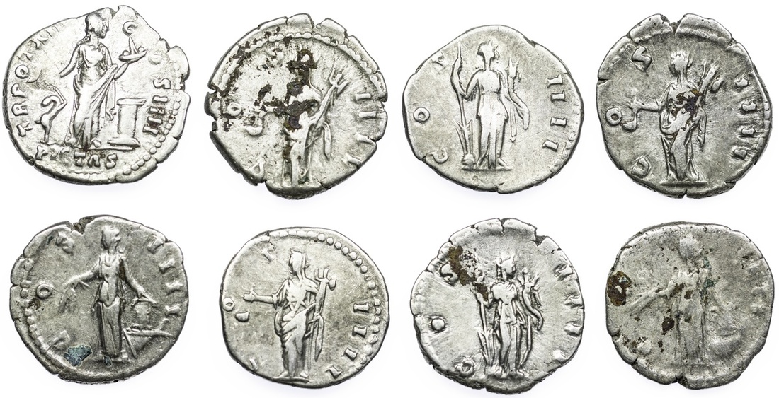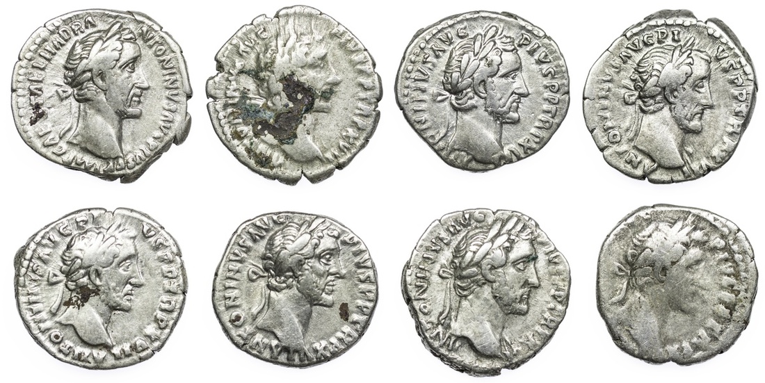 Roman Empire, Antoninus Pius (AD 138-161), AR Denarii (8): i) Rome, IMP CAES T AEL HADR ANTONINVS PIVS P P, laureate head right, rev. TR POT XIII[I] COS IIII, Pietas standing right, holding hind by neck in her right hand and plate of fruits in her left, altar to the right, PIETAS in exergue, 3.34g (RIC 201; BMC 735), good fine to very fine; ii) another, as before, possible contemporary plated copy, ANTONINVS AVG PIVS P P TR P X[...], rev. COS IIII, Annona standing left, 2.65g (RIC 204ff; cf. BMC 765ff [Spink XRF, Obverse: Ag: 86.81%; Cu: 11.62%; Pb 1.57%; Reverse: Ag: 82.71%; Cu 15.56; Pb 1.73%]), fair to good; iii) another, as before, ANTONINVS AVG PIVS P P TR P XVI, rev. COS IIII, Vesta standing left, holding simpulum and palladium, 2.72g (RIC 219; BMC 782), fine; iv) another, as before, rev. COS IIII, Fortuna standing right, holding cornucopiae and rudder, 2.51g (RIC 222; BMC 790), lustrous, fine; v) another, as before, 3.22g, good to fine; vi) another, as before, ANTONINVS AVG PIVS P P TR P XVII, rev. COS IIII, Vesta standing left, holding simpulum and palladium, 3.06g (RIC 229a; BMC 806), near fine; vii) another, as before, 3.01g, fair to good; viii) another, as before, ANTONINVS AVG PIVS P P TR P XVII, rev. COS IIII, Annona standing left, holding grain-ears and resting on modius set on prow, 3.12g (RIC 231; BMC 809), fine or thereabouts; (8).